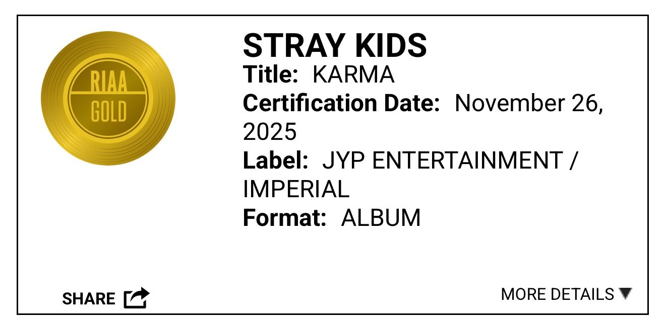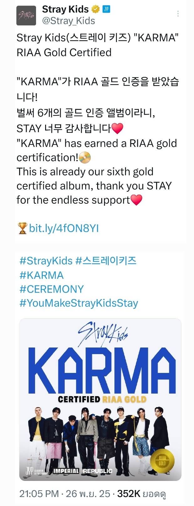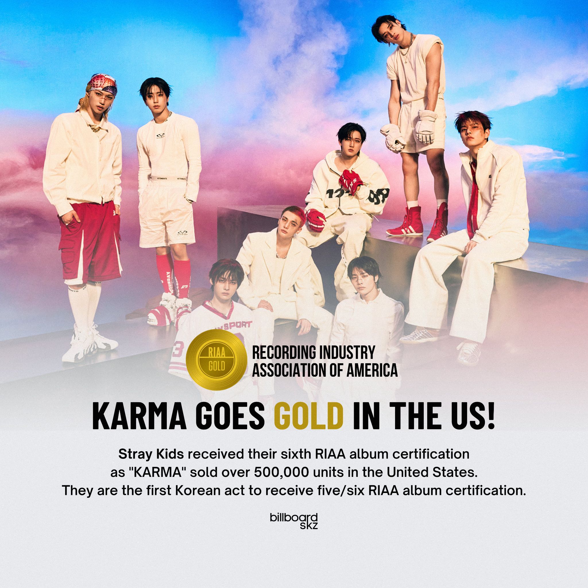🔥 Stray Kids “KARMA” ได้รับการรับรองอย่างเป็นทางการระดับ GOLD จาก RIAA สมาคมผู้ประกอบกิจการเพลงของสหรัฐอเมริกา