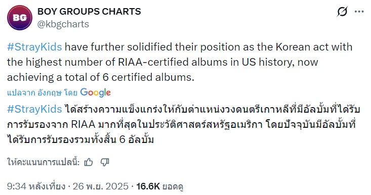 Stray Kids ขยายสถิติเป็นวงดนตรีเกาหลีที่มีอัลบั้มที่ได้รับการรับรองจาก RIAA มากที่สุดในประวัติศาสตร์สหรัฐอเมริกา โดยปัจจุบันมีอัลบั้มที่ได้รับการรับรองรวมทั้งสิ้น 6 อัลบั้ม