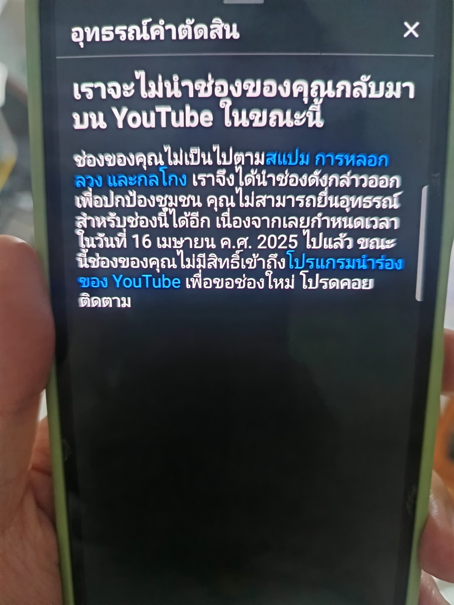 ทั้งการแจ้งเตือนในยูทูปหรืออีเมลที่เชื่อมไว้ แต่กลับขึ้นมาว่าไม่สามารถอุทธรณ์ได้ จึงสงสัยว่าเพราะอะไรและสามารถกู้คืนบัญชีเดิมได้อย่างไรคะ