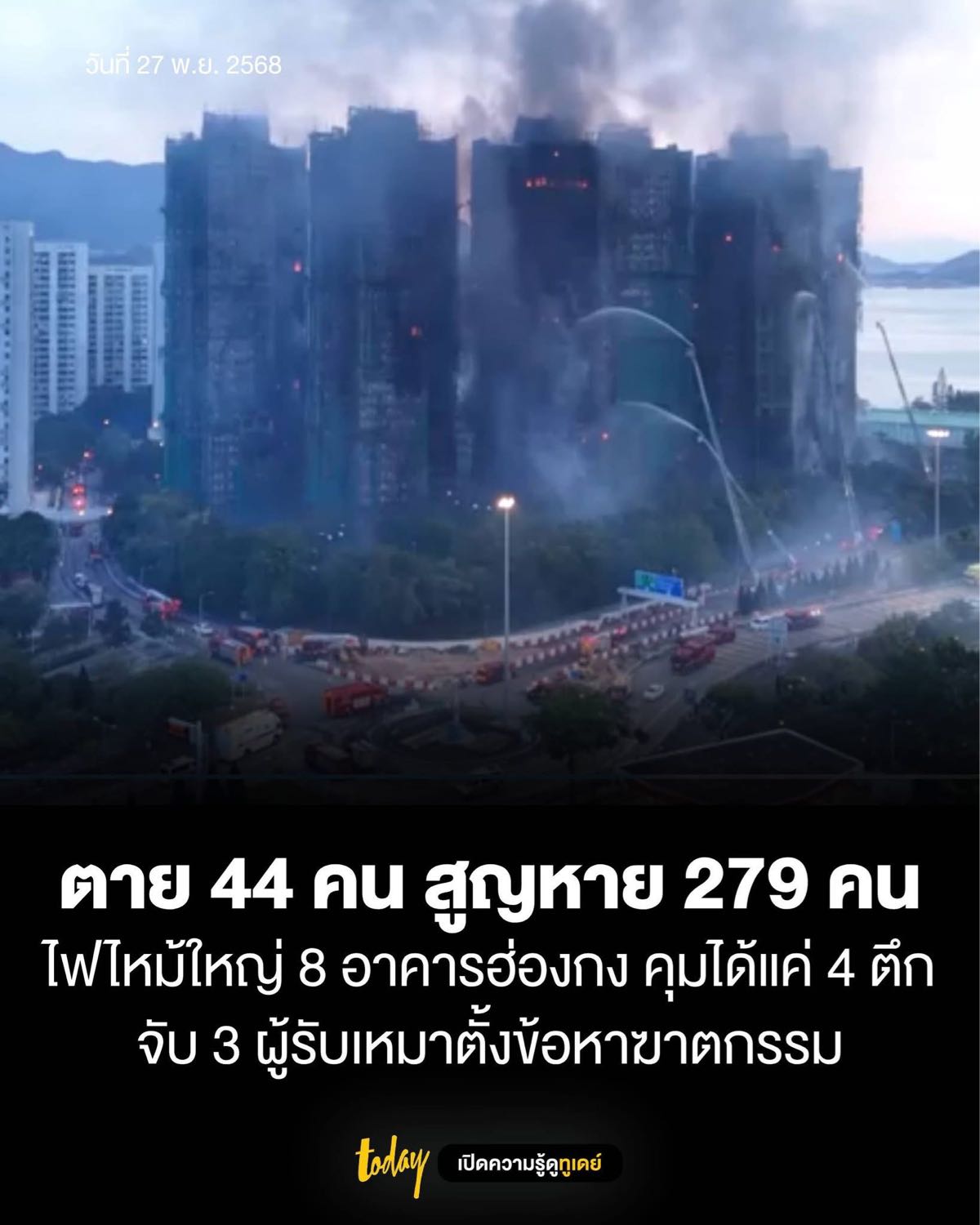 ความคืบหน้าเหตุเพลิงไหม้กลุ่มอาคารสูง 8 อาคารในฮ่องกงเช้าวันนี้ (27 พ.ย.) เจ้าหน้าที่ยืนยันตัวเลขผู้เสียชีวิตล่าสุดพุ่งสูงถึงอย่างน้อย 44 คน มีตัวเลขผู้บาดเจ็บสาหัสถึง 45 คน และยังมีผู้สูญหายอีก 279 คน