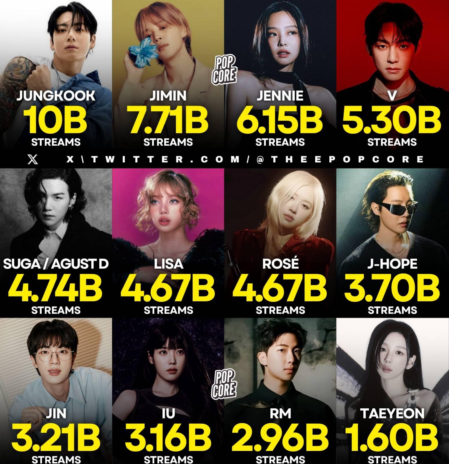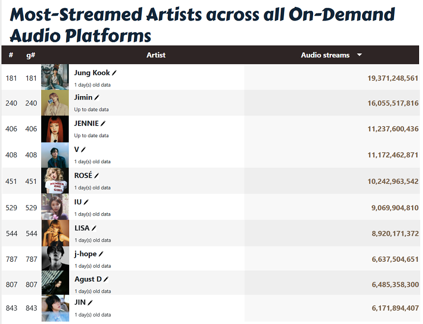 Most streamed k-soloists across all On-Demand Audio Platforms (Spotify, Apple Music, Amazon Music, Deezer, YouTube Music, Melon etc.)
