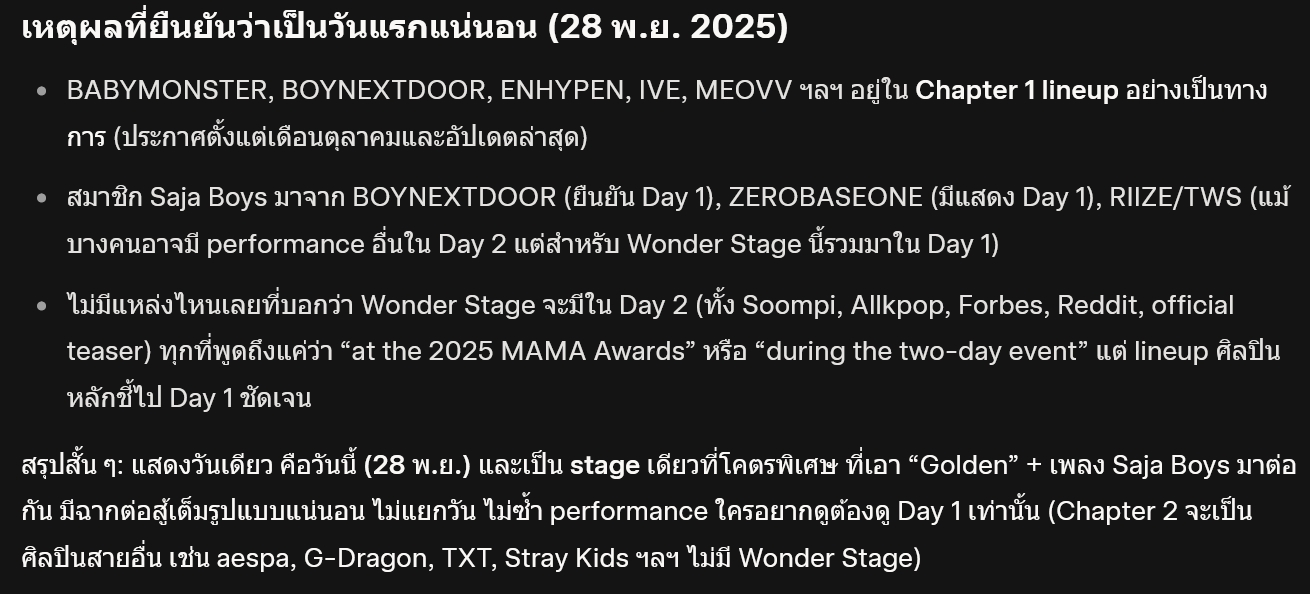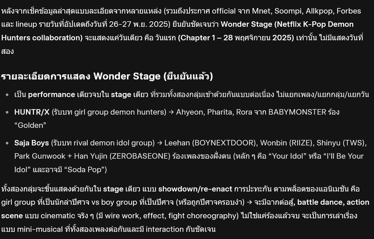 อีกประเด็นที่ยังไม่ชัดเจนคือการแสดงจะมีในวันแรก หรือวันที่ 2 หลายคนเล็งว่าน่าจะเป็นวันแรก เพราะรายชื่อ Idol ที่จะแสดงใน Wonder Stage ส่วนใหญ่อยู่ใน Line up วันแรกกันทั้งนั้น ก็เลยถาม Grok มาว่าจะแสดงวันไหน แล้วรายละเอียดการแสดงเป็นอย่างไร ซึ่ง Grok ฟันธงมาว่าจะแสดงในวันแรกนะ ถูกหรือผิดมารอดูกัน