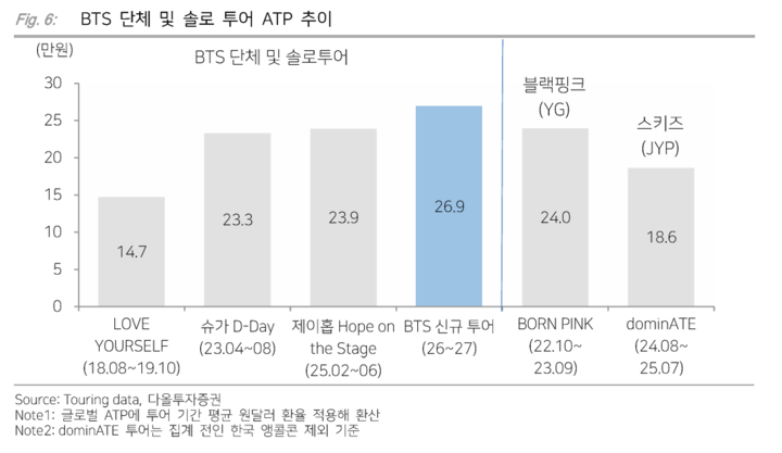 Lim Do-young นักวิจัยจาก Daol Investment & Securities กล่าวเมื่อวันที่ 28 ว่า "สำหรับทัวร์ BTS เราควรคาดหวัง 'เซอร์ไพรส์' ในแง่ของการเพิ่มขึ้นของราคาตั๋วมากกว่าจำนวนครั้งหรือจำนวนผู้เข้าร่วม" และยังคงมุมมองการลงทุนของเขาไว้ที่ 'ซื้อ' และราคาเป้าหมายหุ้นที่ 420,000 วอน