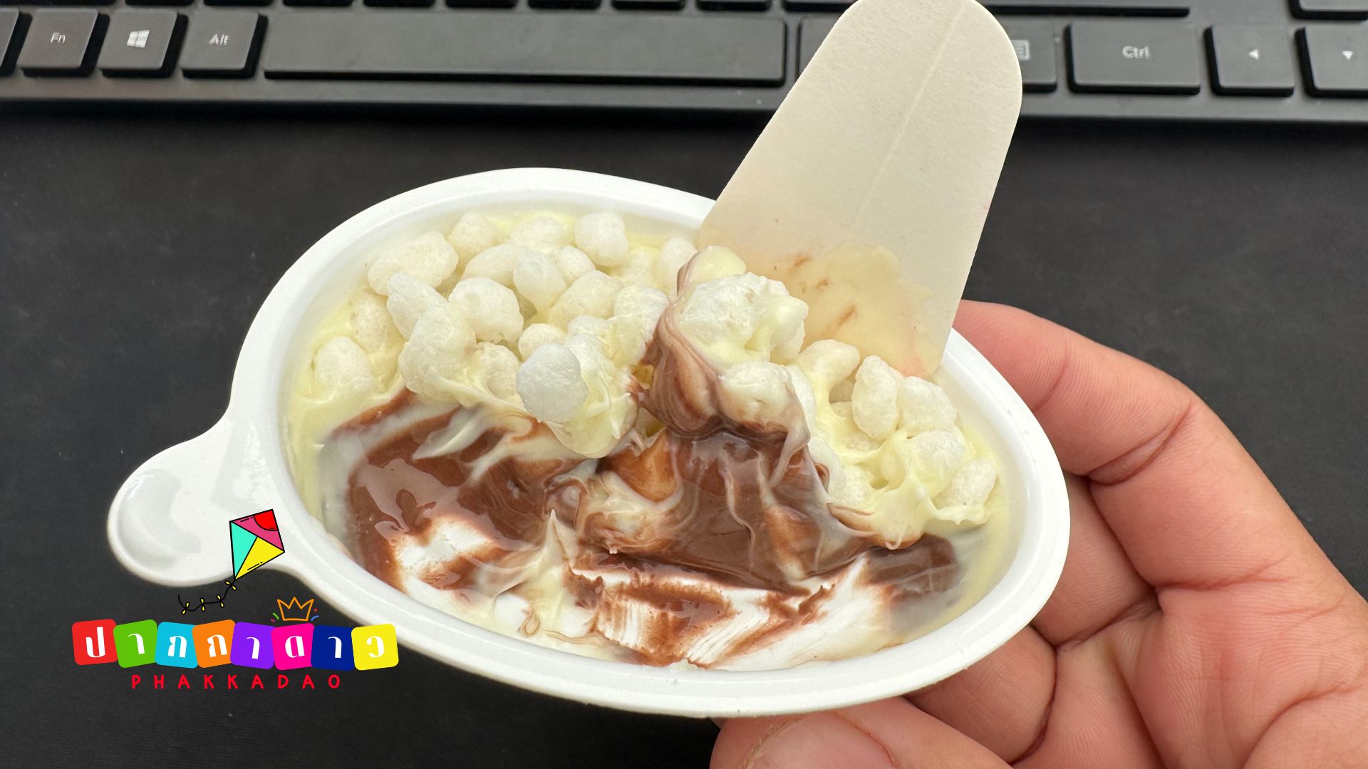ปฏิบัติการ "จ้วง" ความลับใต้ภูเขาน้ำแข็ง ความพีคของเจ้า Kinder Creamy มันอยู่ที่ตอนเอาช้อนจ้วงลงไปนี่แหละ พอตักลงไปลึกๆ แล้วงัดขึ้นมา... ผ่าม! ข้างล่างน้องเขาซ่อน "ครีมโกโก้" เข้มข้นเอาไว้ การผสมผสานระหว่าง นม + โกโก้ + ข้าวพอง