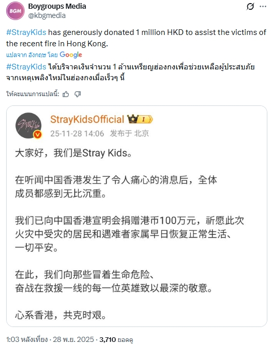 🔥 Stray Kids ได้บริจาคเงิน 1 ล้านดอลลาร์ฮ่องกง (128,000 ดอลลาร์สหรัฐ) ให้กับ World Vision Hong Kong เพื่อช่วยเหลือผู้ได้รับผลกระทบและครอบครัวของผู้เสียชีวิตทุกราย แสดงความเสียใจอย่างสุดซึ้งต่อเหตุการณ์เพลิงไหม้ในฮ่องกงเมื่อเร็วๆ นี้