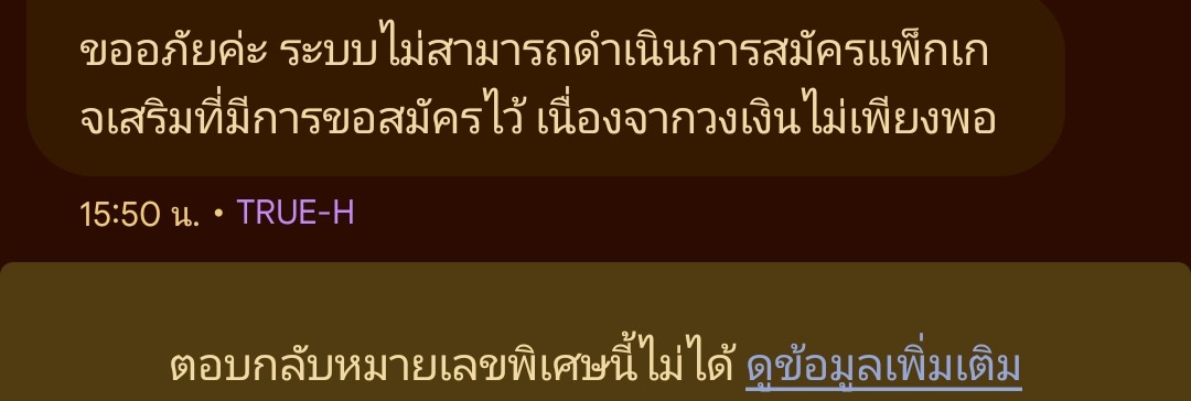คือเรากดสมัครแพ็กเกจ เน็ตไม่อั้น 20Mbps สปีด 20Mbps เน็ตไม่จํากัด 30 วัน 475 บาท ไม่รวมภาษี ที่เป็นดีลพิเศษไปอะคะ แล้วชำระเงิน ทั้งหมด 508.25 บาทผ่าน ทรูมันนี่ วอลเล็ท แต่เป็นเบอร์ทรูมันนี่ของ ais นะคะพอดีอัพเกรดเป็นขั้นสูงแล้วเลยไม่อยากเปลี่ยนเบอร์คะทีนี้พอเสียงเงินไปแล้วแต่ ทาง messages ขึ้นว่าไม่สามารถสมัครแพ็คเกจนี้ได้ เนื่องจากวงเงินไม่เพียงพอแต่มันหักไปแล้วอะคะอยากถามว่าขอเงินคืนได้ไหม🥹🥹🥹