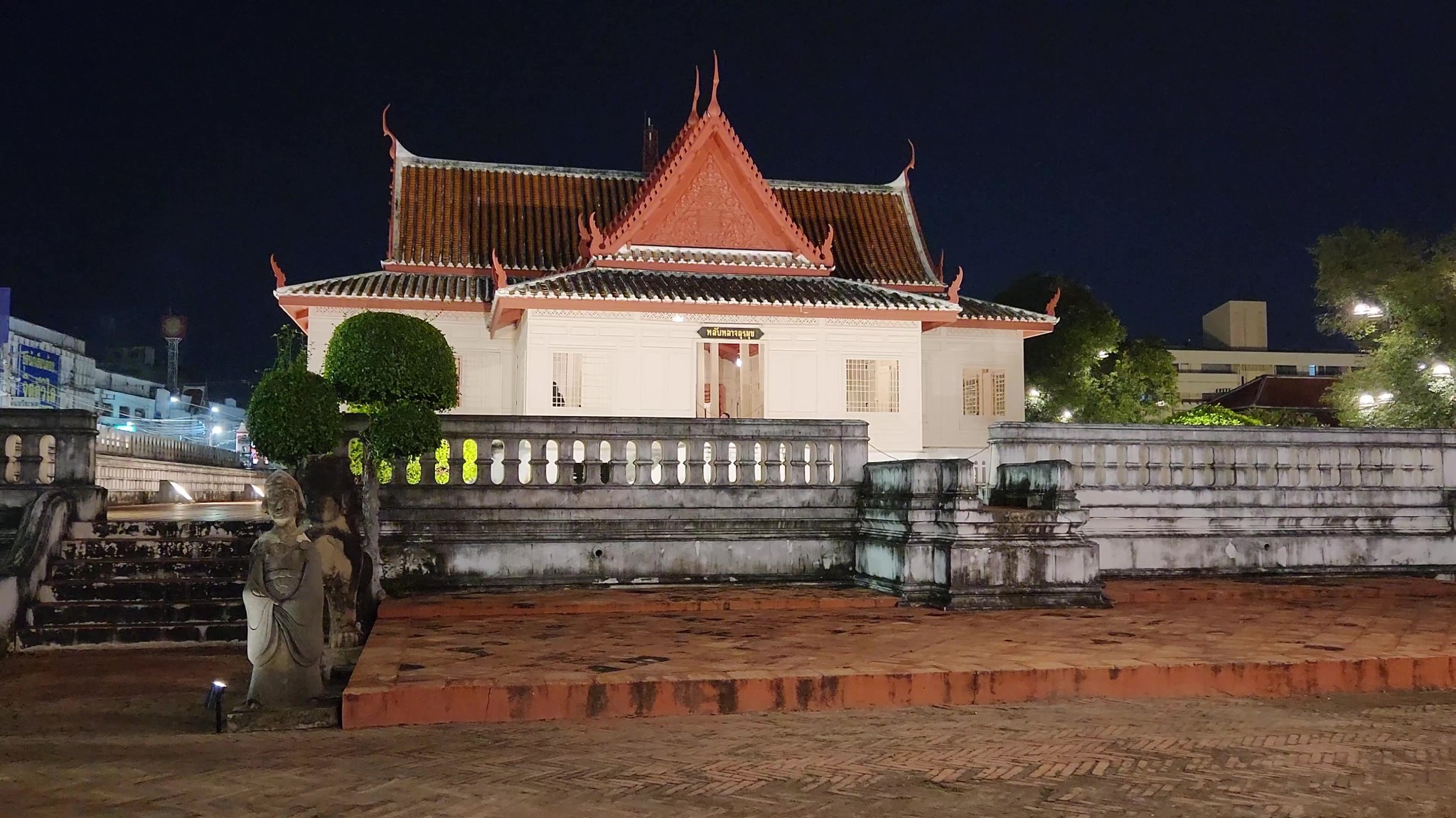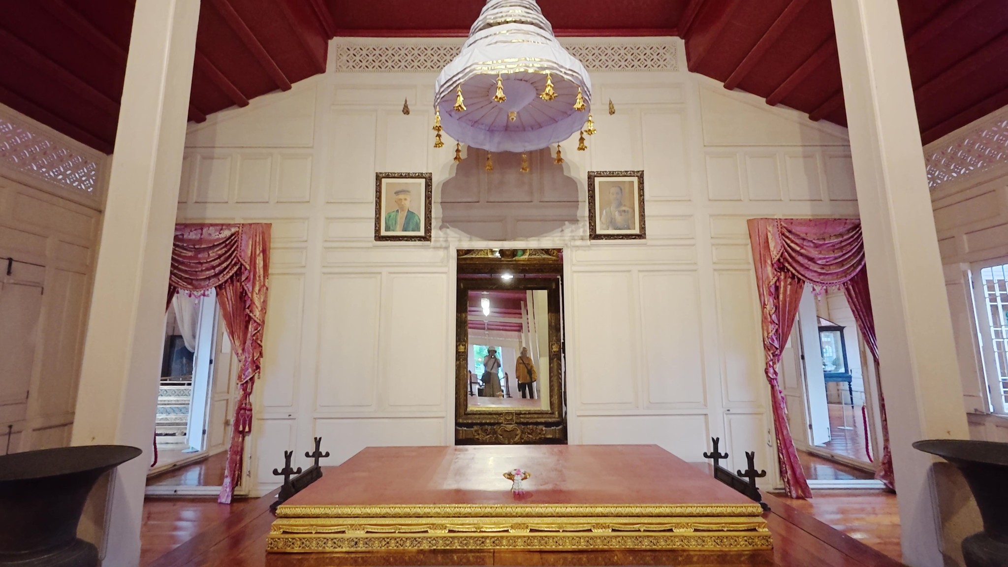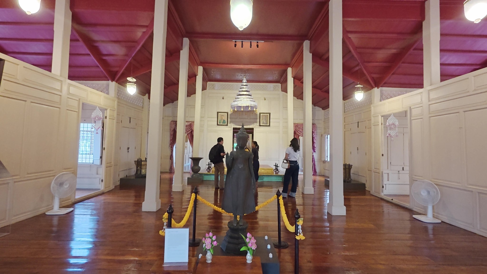 ด้านบนจะเห็นฉัตรแขวนอยู่ เป็นหนึ่งในสัญลักลักษณ์ของพระมาหากษัติริย์