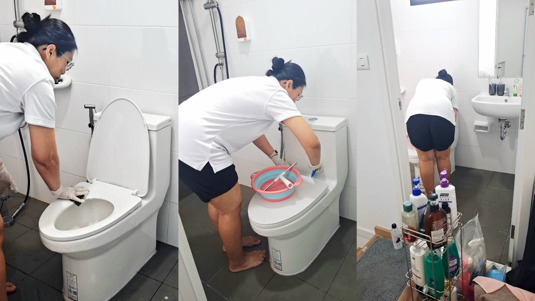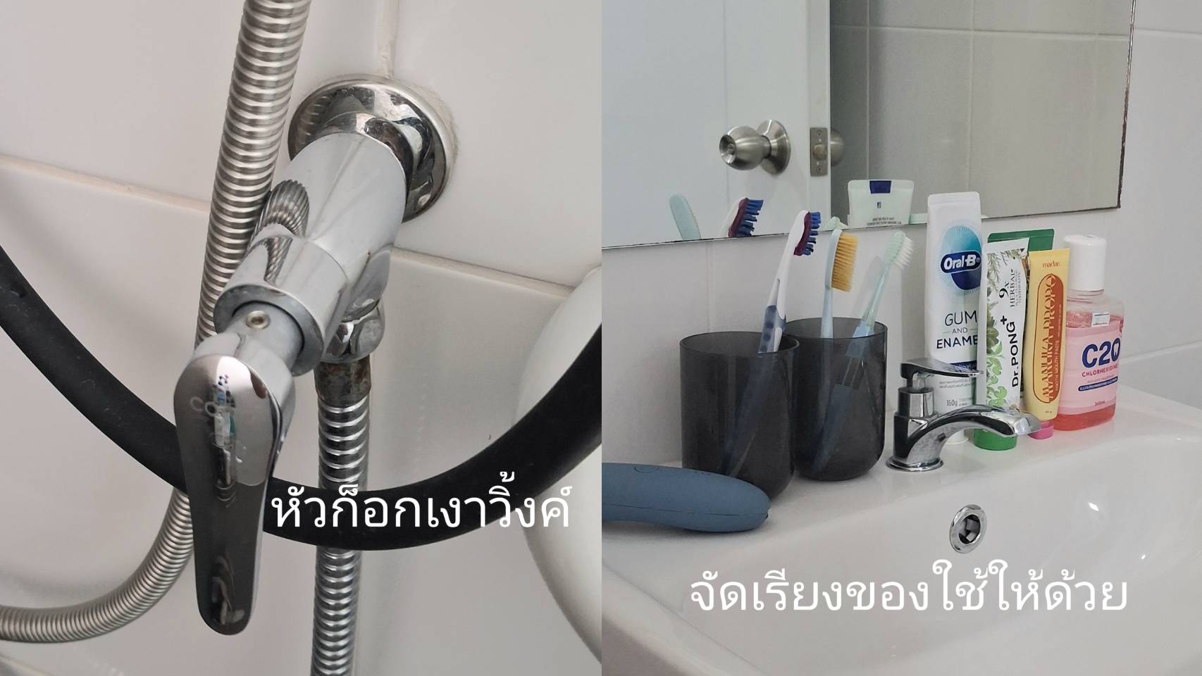 แม่บ้านเริ่มจากการล้างห้องน้ำก่อนเลยค่ะ ซึ่งแม่บ้านใช้เวลาทำห้องน้ำประมาณ 45 นาที แล้วเรียกให้เราไปดูงานก่อน