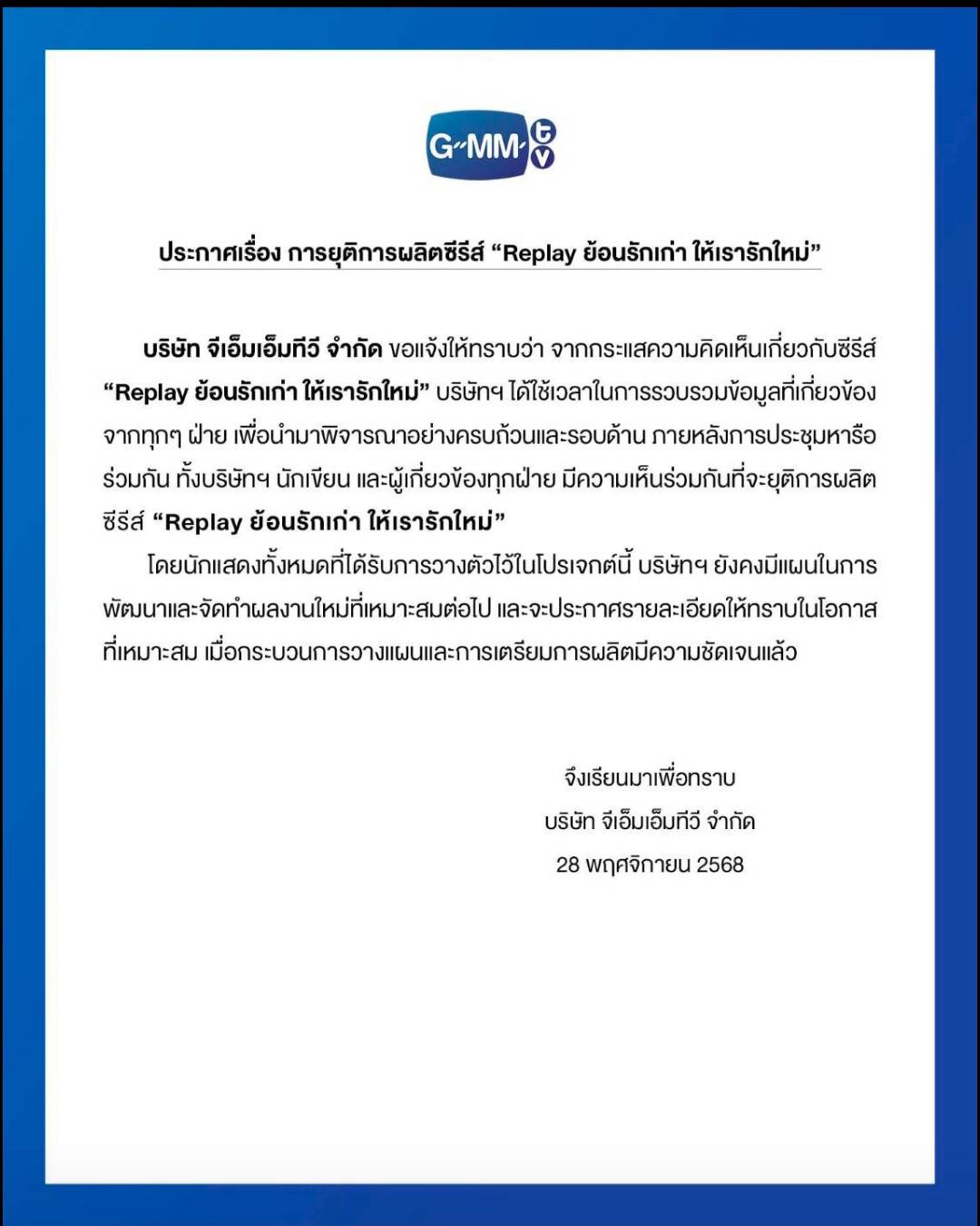 G''MM' ประกาศเรื่อง การยุติการผลิตซีรีส์ "Replay ย้อนรักเก่า ให้เรารักใหม่"