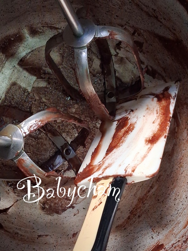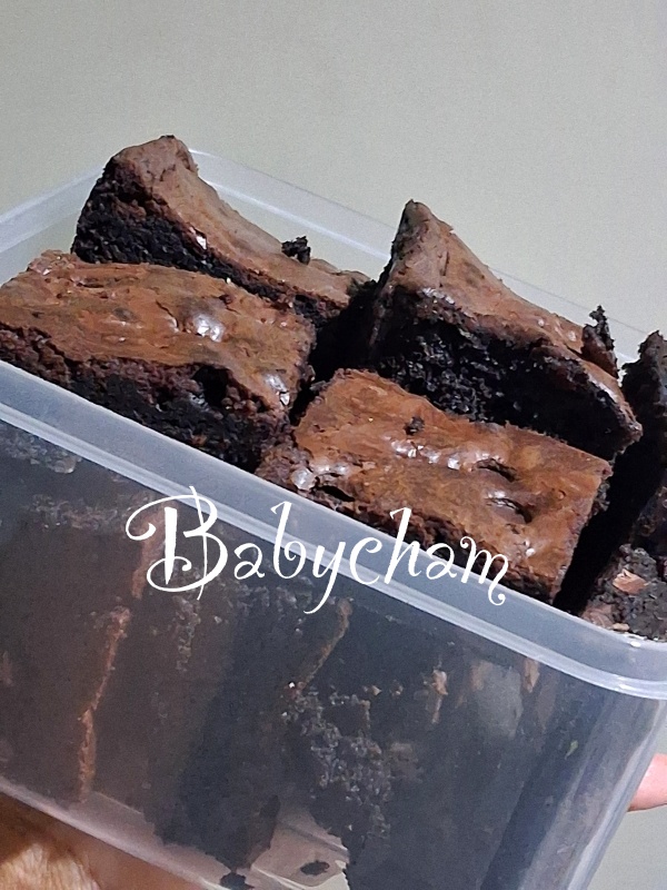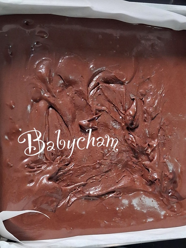 มองนาฬิกา บ่าย 4 โมงกว่า ถอนหายใจเฮือกนึง แล้วก็ลุกไปเตรียมของที่มี หอบทั้งหมดเดินเข้าครัว ลูกตะโกนบอก แม่จ๋าไม่ใส่ถั่วนะ ช็อคโกแลตเพียวๆ จัดการตามที่ลูกค้าสั่งเสมอค่ะ 55 ใส่ถาด 8x8 ....สภาพเหมือนผสมปูนทำซิเมนต์ไหมเนี่ย 55