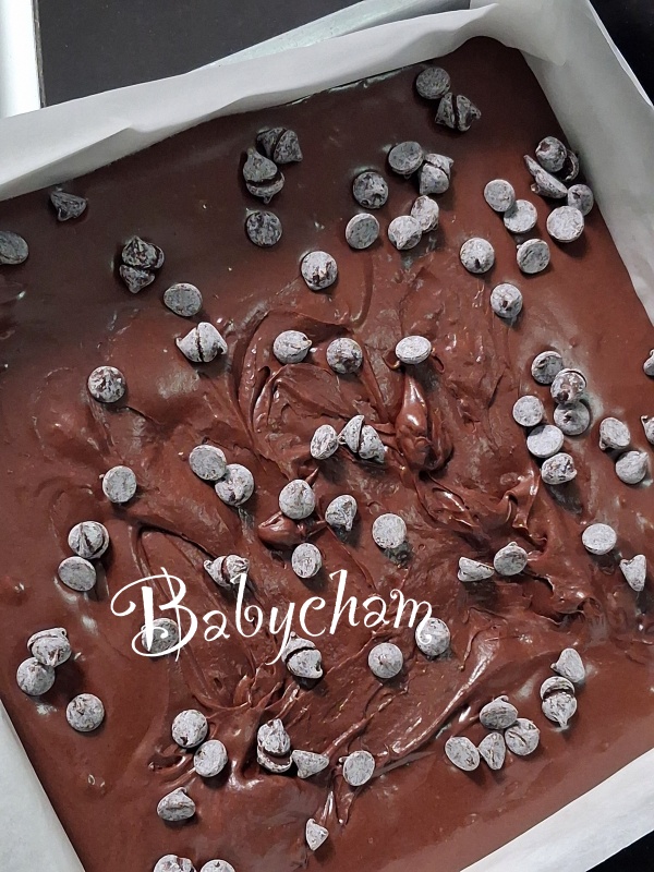 ล้างเสร็จสรรพทุกสิ่ง ก็กลับมาจัดการถาดบราวนีที่พักไว้ ช็อคโกแลตชิป โปรยลงไปตามคำขอ พอโรยช็อคชิป ดูไม่เหมือนผสมปูนแล้วนะ 55