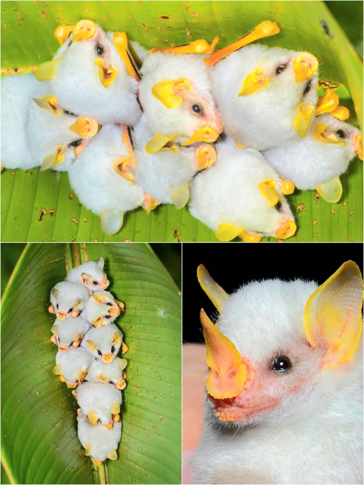 "ค้างคาวขาวฮอนดูรัส" ค้างคาวขนาดเล็กน่ารัก ขนสีขาวและใบหู จมูก และริมฝีปากสีเหลืองสดใส