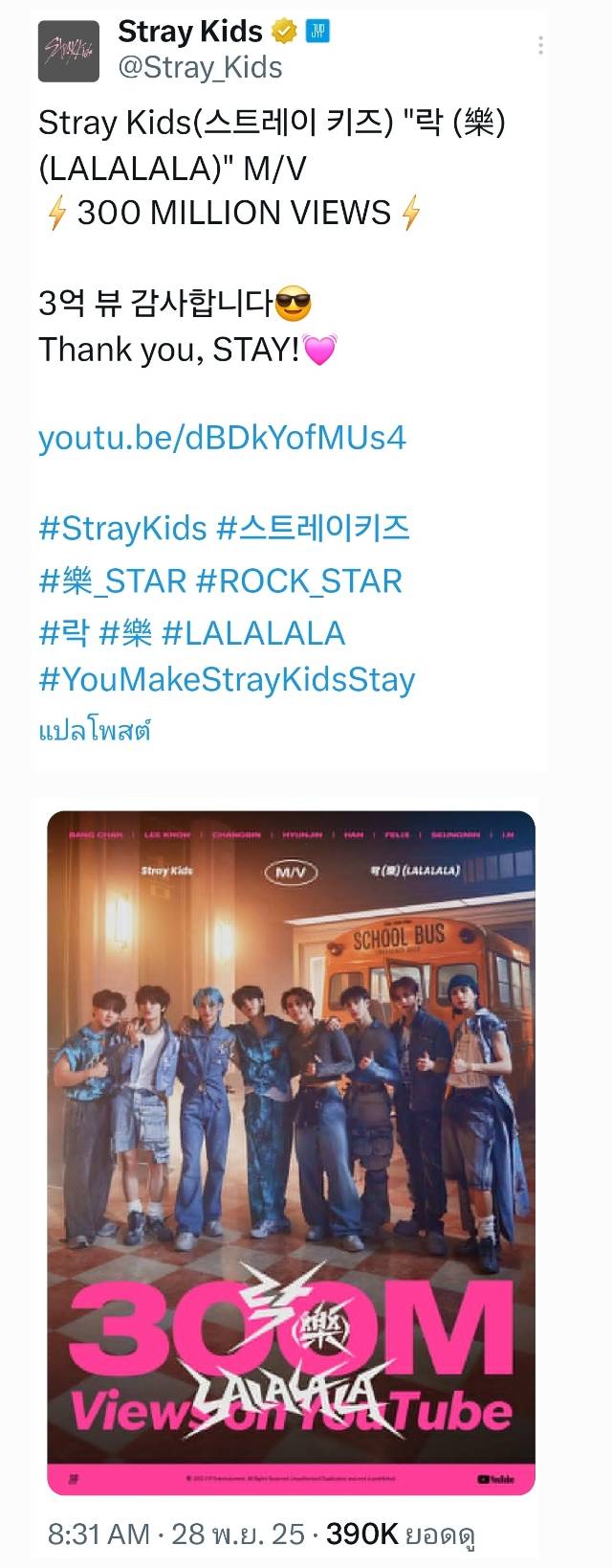 🔥 Stray Kids "LALALALA" เป็น MV ตัวที่ 5 มียอดวิวทะลุ 300,000,000 ครั้ง (300 ล้าน) บน YouTube และเป็นอันดับ 1 ของเจน 4