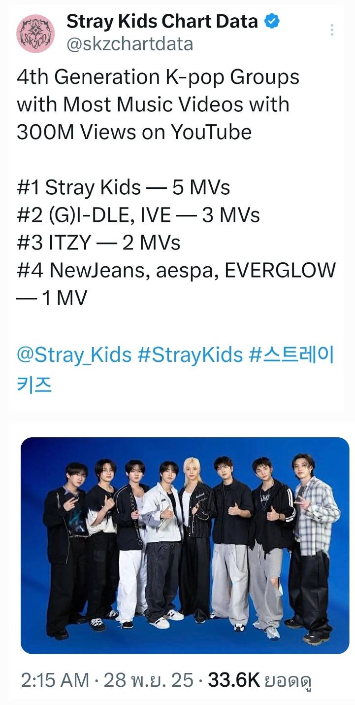 Stray Kids มีมิวสิควิดีโอทั้งหมด 5 เพลงที่มียอดวิวเกิน 300 ล้านครั้ง ดังนี้