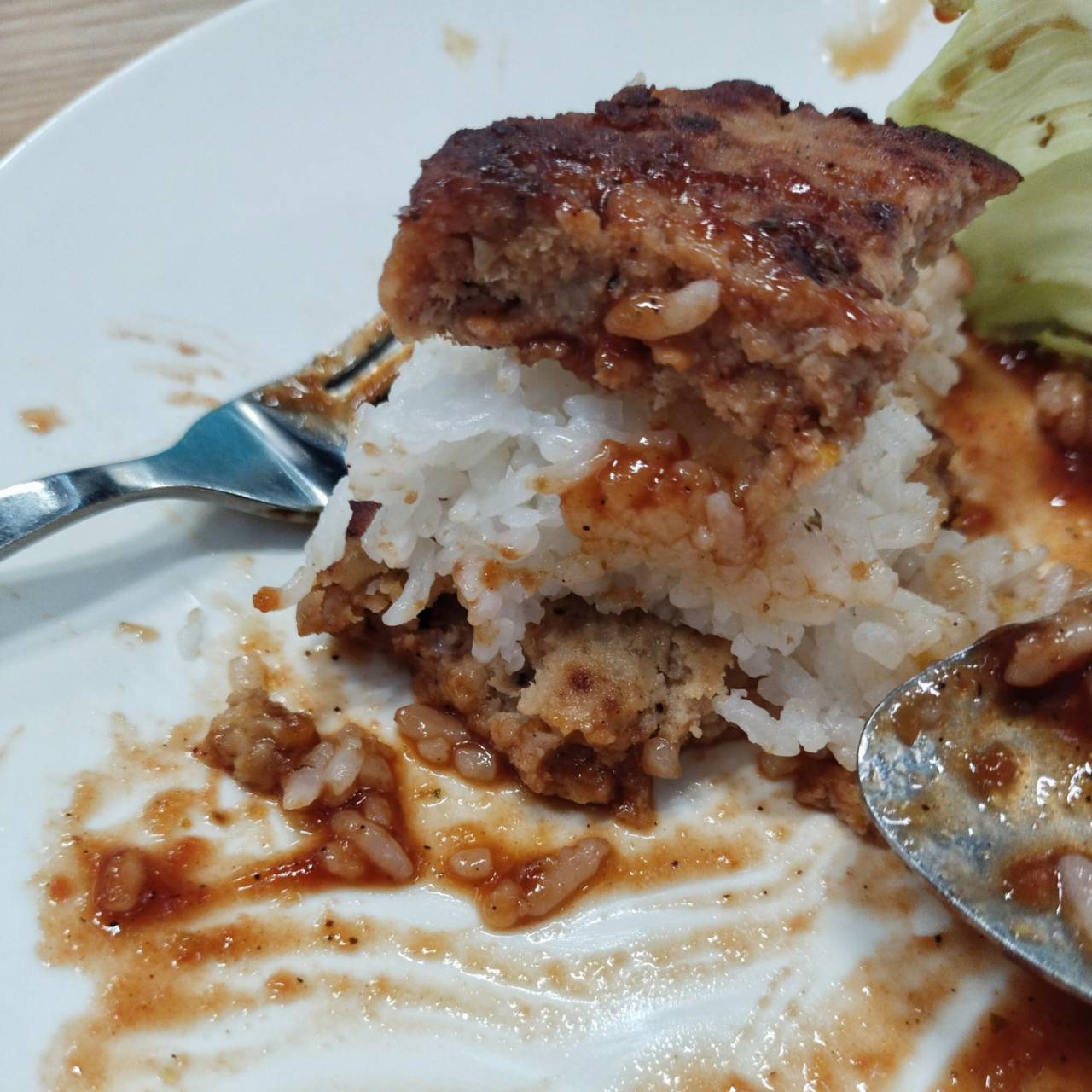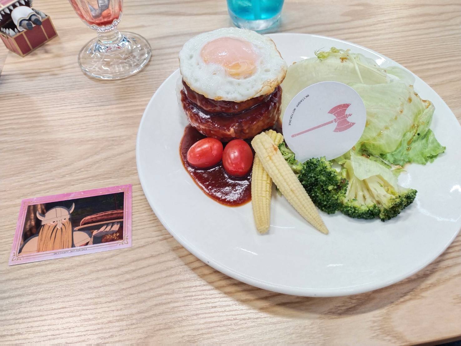 เป็นแฮมเบอร์เกอร์ข้าว ที่เอาเนื้อแฮมเบอร์เกอร์สองชิ้นมาประกบข้าวแทน จานนี้ไม่ค่อยเหมือนในเรื่องเพราะผักเกินครึ่งจาน (ฮา)