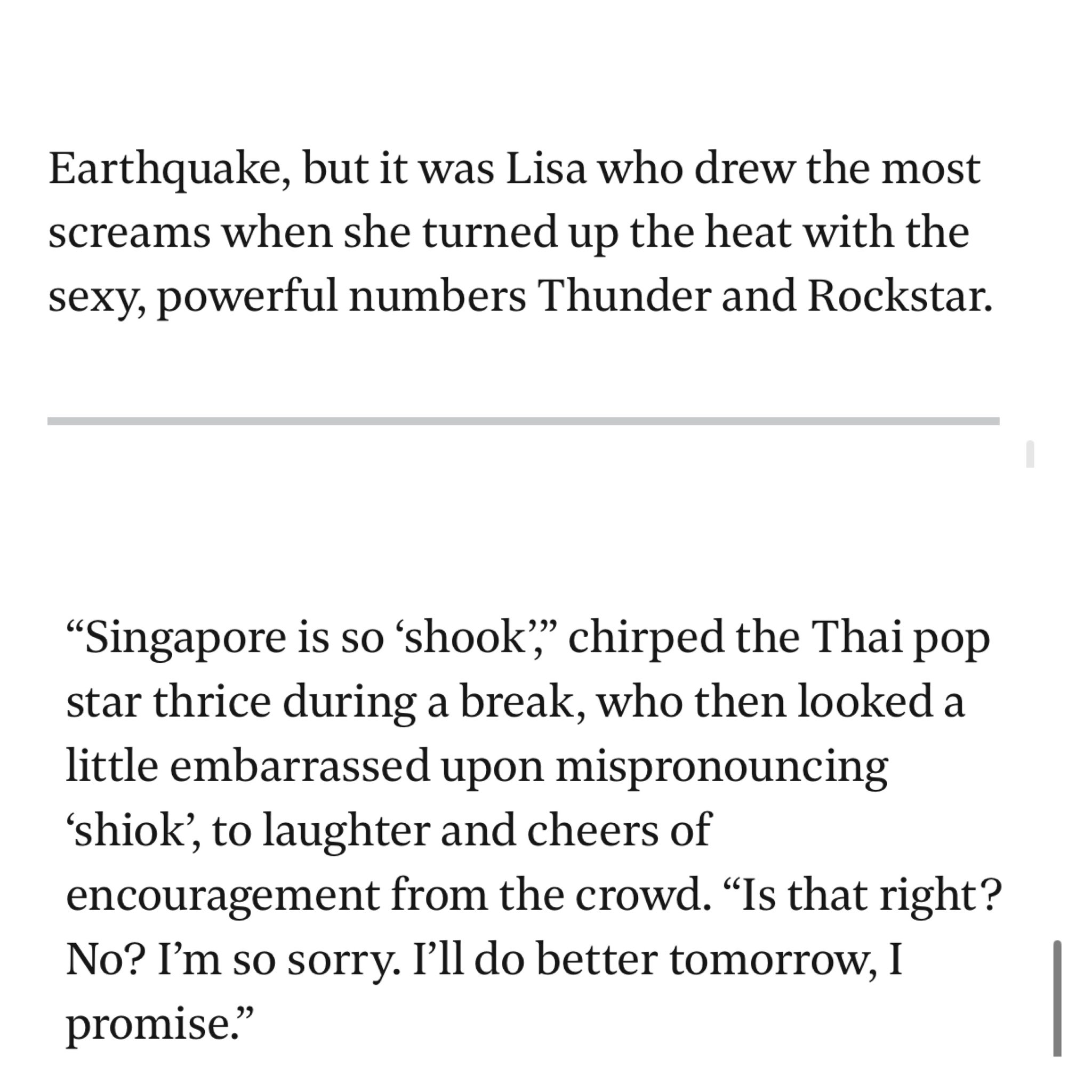 “… แต่ลิซ่านี่แหละที่เรียกเสียงกรี๊ดได้มากที่สุด เมื่อเธอเร่งความร้อนแรงด้วยเพลงสุดเซ็กซี่ทรงพลังอย่าง Thunder และ Rockstar…” - @straits_times สิงคโปร์ 'ตกตะลึง' มาก... ป๊อปสตาร์ชาวไทยพูดขึ้นสามครั้งระหว่างพักเบรก ก่อนจะดูเขินอายเล็กน้อยเมื่อออกเสียงคำว่า 'shiok' ผิด ท่ามกลางเสียงหัวเราะและเสียงเชียร์ให้กำลังใจจากแฟนๆ “จริงเหรอ? ไม่นะ? ฉันขอโทษจริงๆ พรุ่งนี้ฉันจะทำดีกว่านี้ สัญญา”