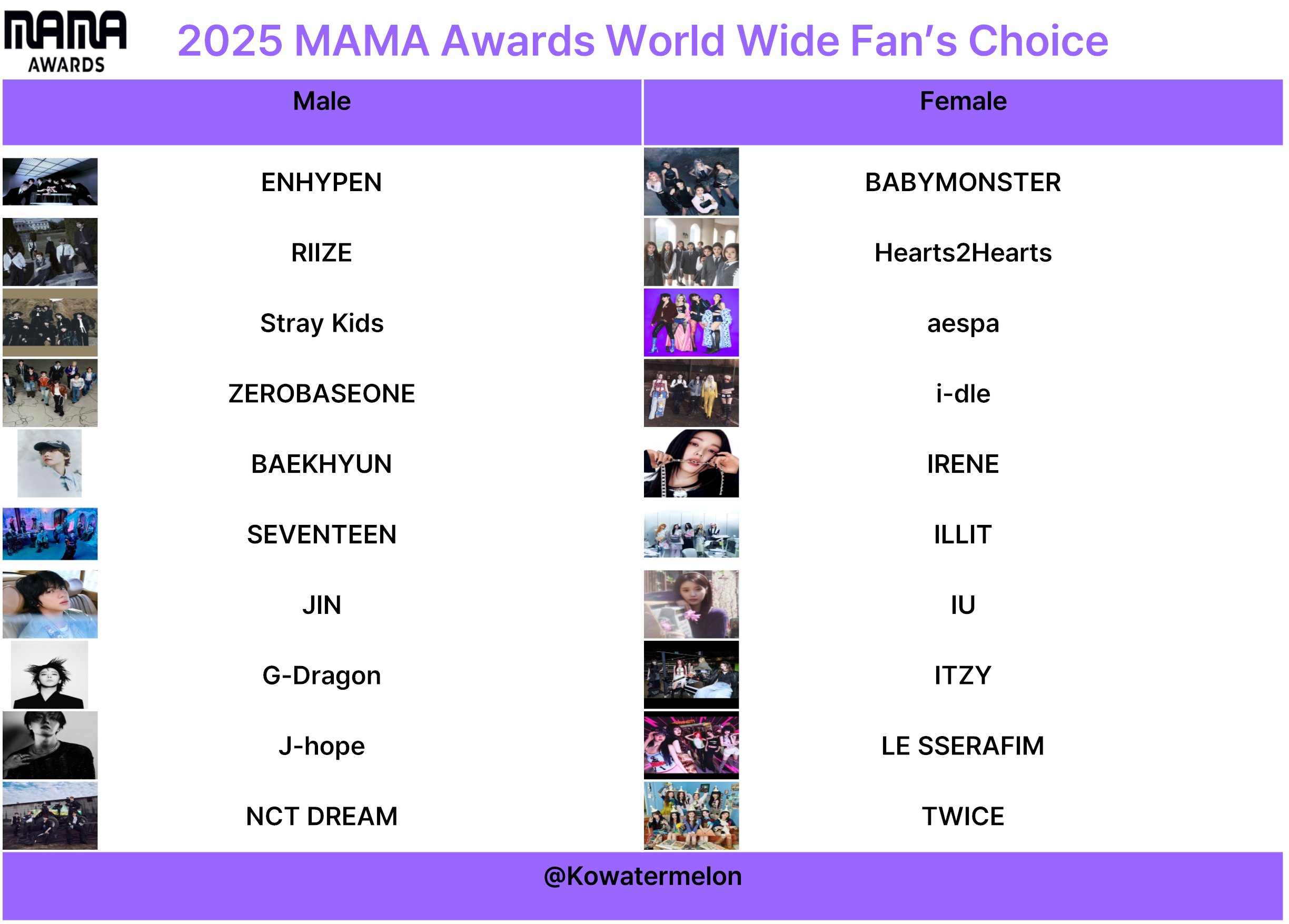 รางวัล “Fans' Choice” award จากงาน MAMA AWARDS 2025 มาจากการโหวตของแฟนๆทั่วโลกโดย BABYMONSTER มีคะแนนสูงที่สุด
