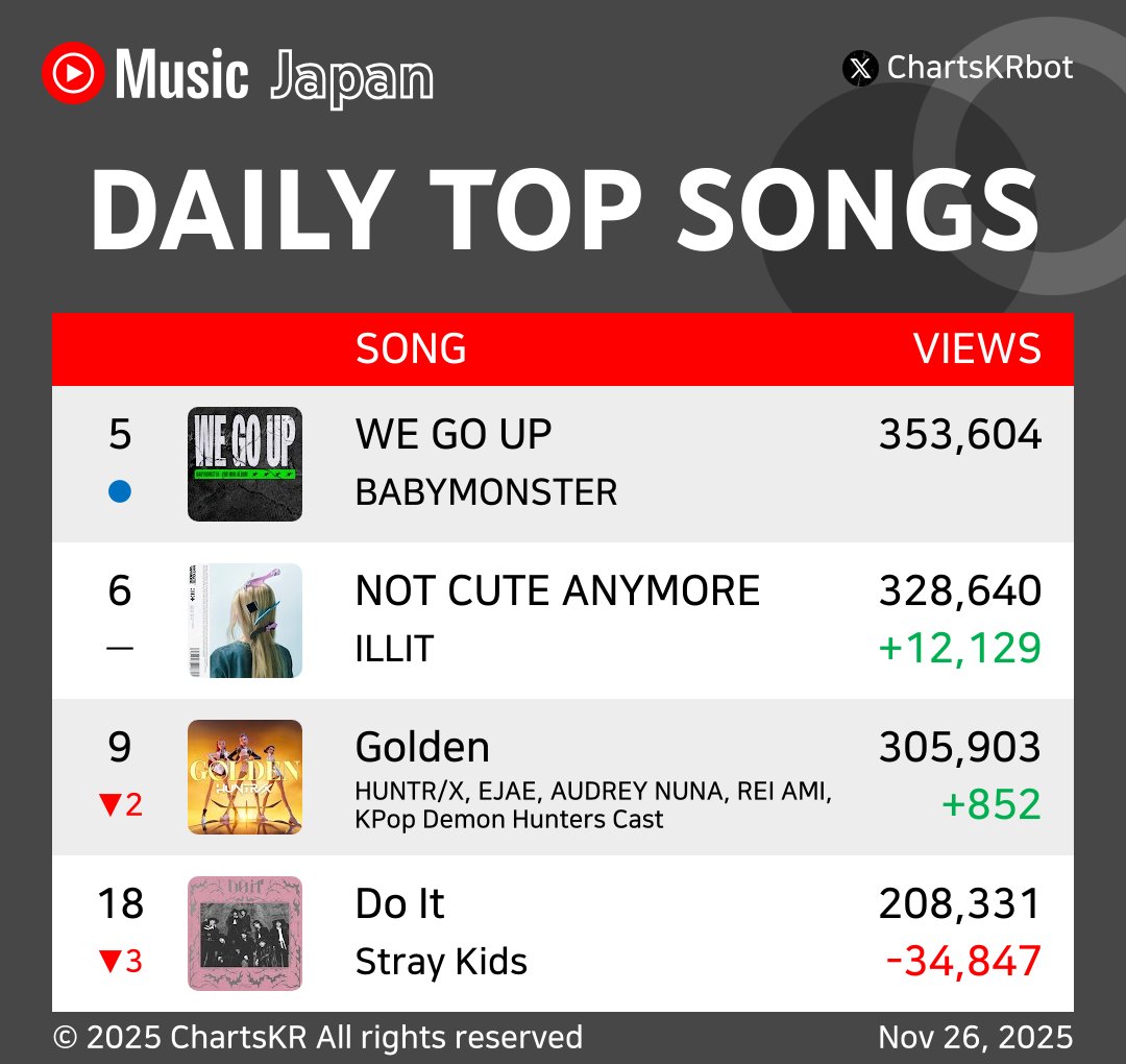 เพลง WE GO UP ของ BABYMONSTER อยู่ในอันดับ 5 บน YouTube Music Japan Daily Top Songs Chart เป็นอันดับ 1 ของศิลปินเคป๊อปทั้งหมด