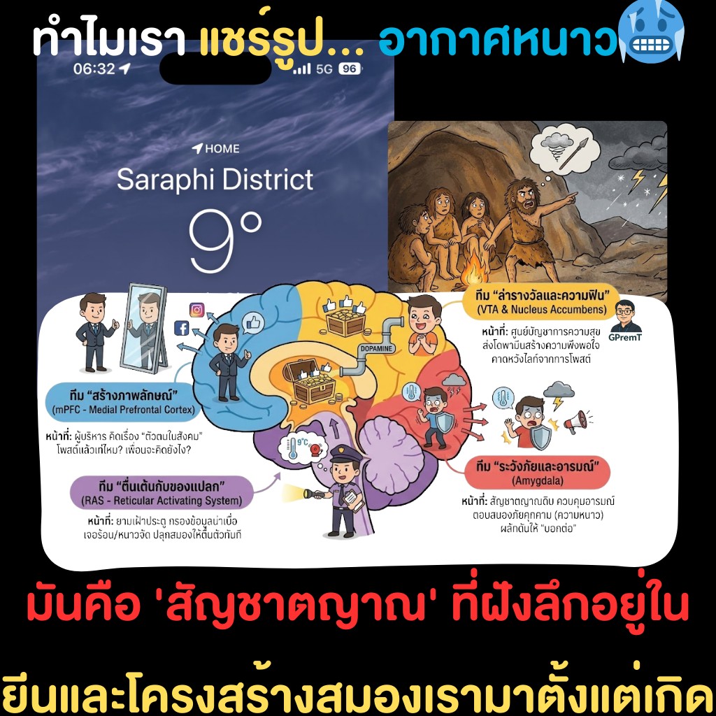 ความหลงใหลในของหายาก (Scarcity): สำหรับคนไทย ความหนาวคือ Rare Item เมื่อสมองเจอสิ่งแปลกใหม่และมีจำกัด เราจะรู้สึกตื่นตัวและอยากเป็นผู้ครอบครอง หรือเป็นคนแรกๆ ที่ได้เผยแพร่ข่าวนั้น