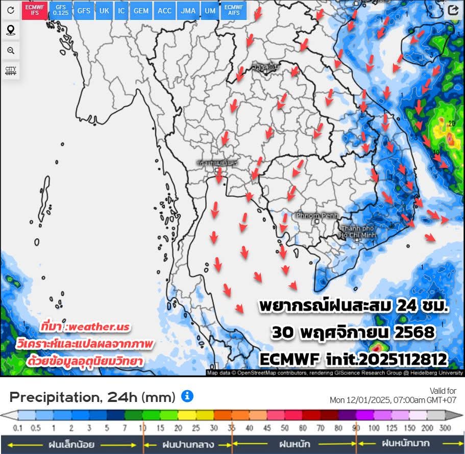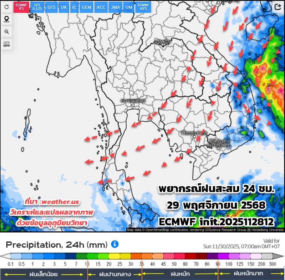 พยากรณ์ฝนสะสมรายวัน 15 วันล่วงหน้า ระหว่าง 29 พ.ย.-13 ธ.ค.68