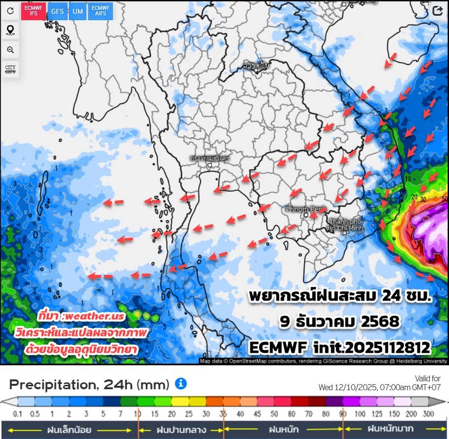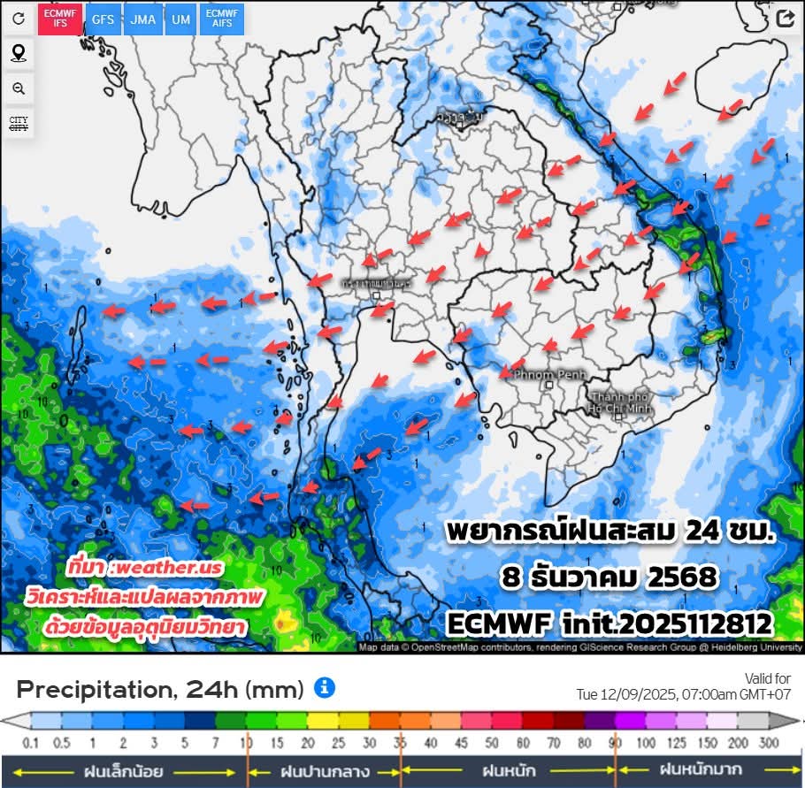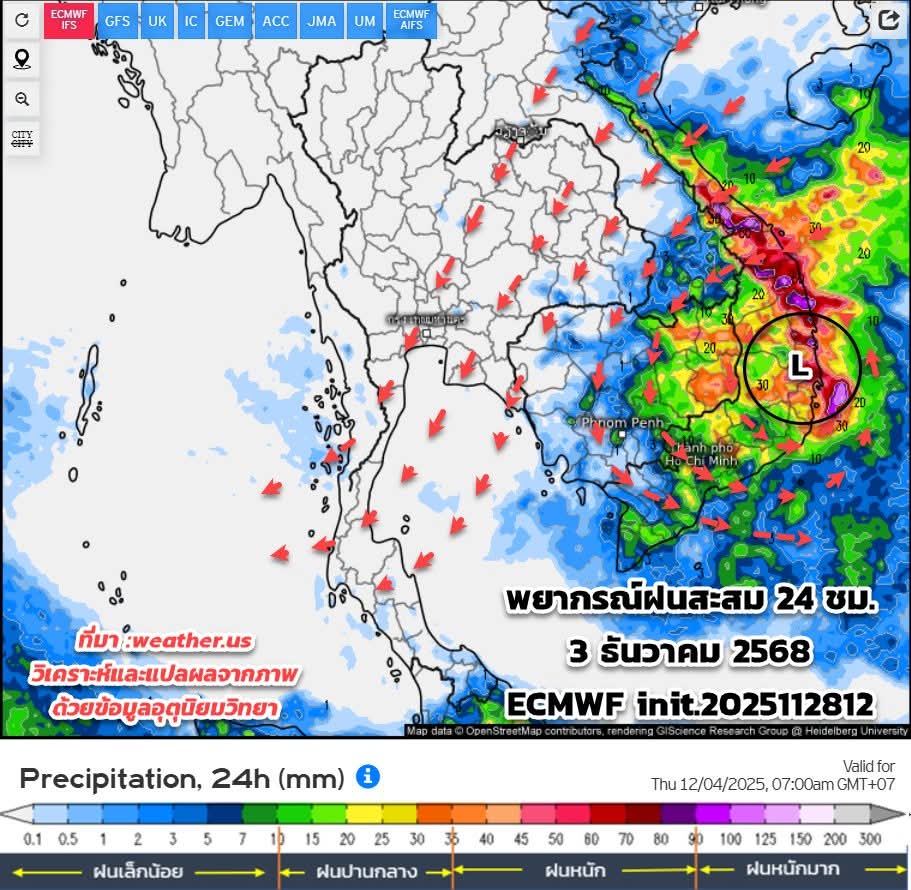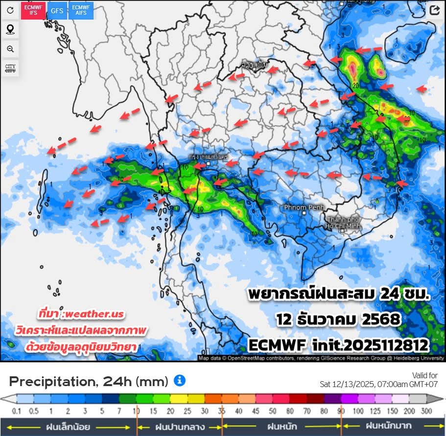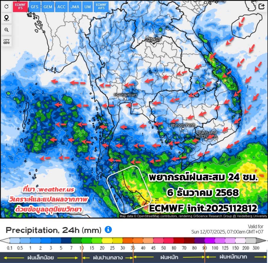 ส่วน 7 - 13 ธ.ค.68 ยังมีมวลอากาศเย็นแผ่เสริมลงมาปกคลุมประเทศไทยตอนบนเป็นระลอกๆ ลมหนาวแรงขึ้น อากาศเย็นลงบริเวณประเทศไทยตอนบน ส่วนบริเวณทะเลจีนใต้ตอนล่างมีการก่อตัวของหย่อมความดอากาศต่ำ (บริเวณเกาะบอร์เนียว) เมื่อลมหนาวแรงขึ้น จะทำให้ภาคใต้มีฝนเพิ่มขึ้นได้ แต่ยังไม่มีสัญญาณฝนตกหนักเมื่อเปรียบกับระลอกที่ผ่านมา ยังเฝ้าระวังและติดตาม(การวิเคราะห์ข้อมูลข้างต้นได้จากแบบจำลองฯ เป็นความคิดเห็นส่วนบุคคล ข้อมูลยังมีการเปลี่ยนแปลง ใช้เป็นแนวทางเพื่อประกอบการตัดสินใจการติดตามสภาพอากาศ)