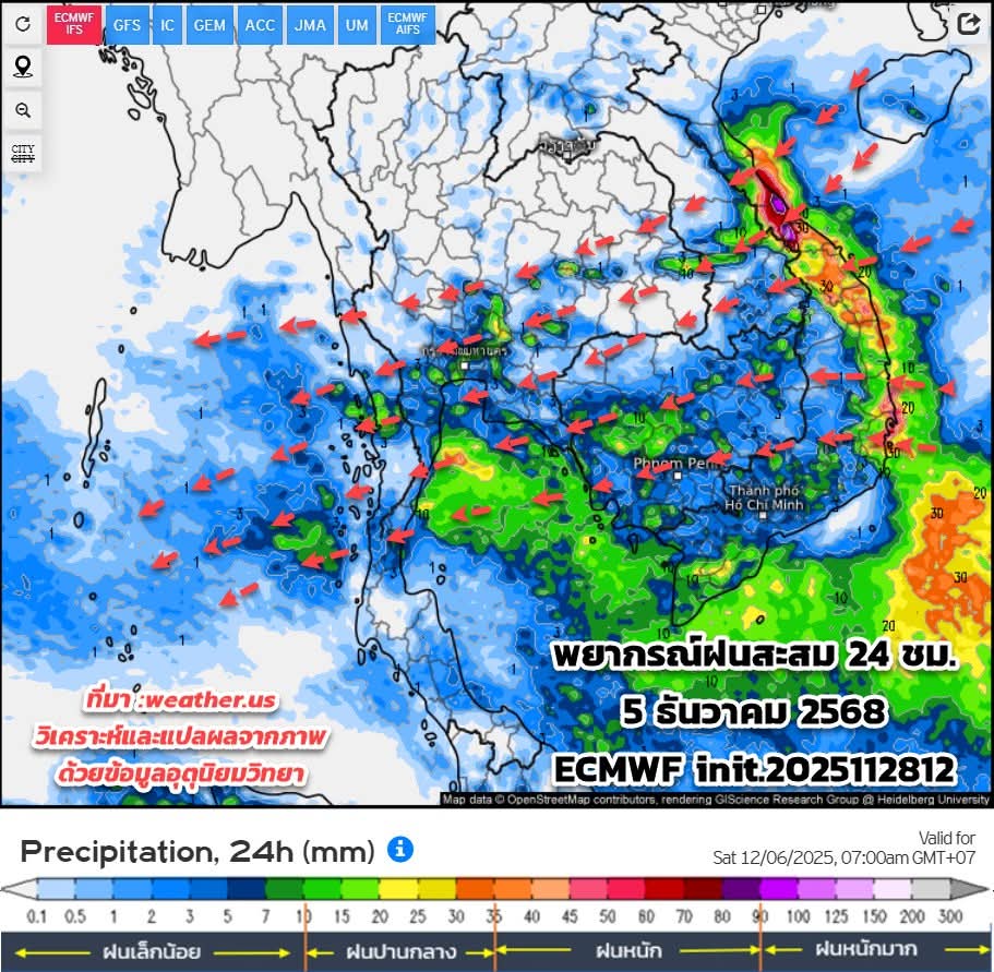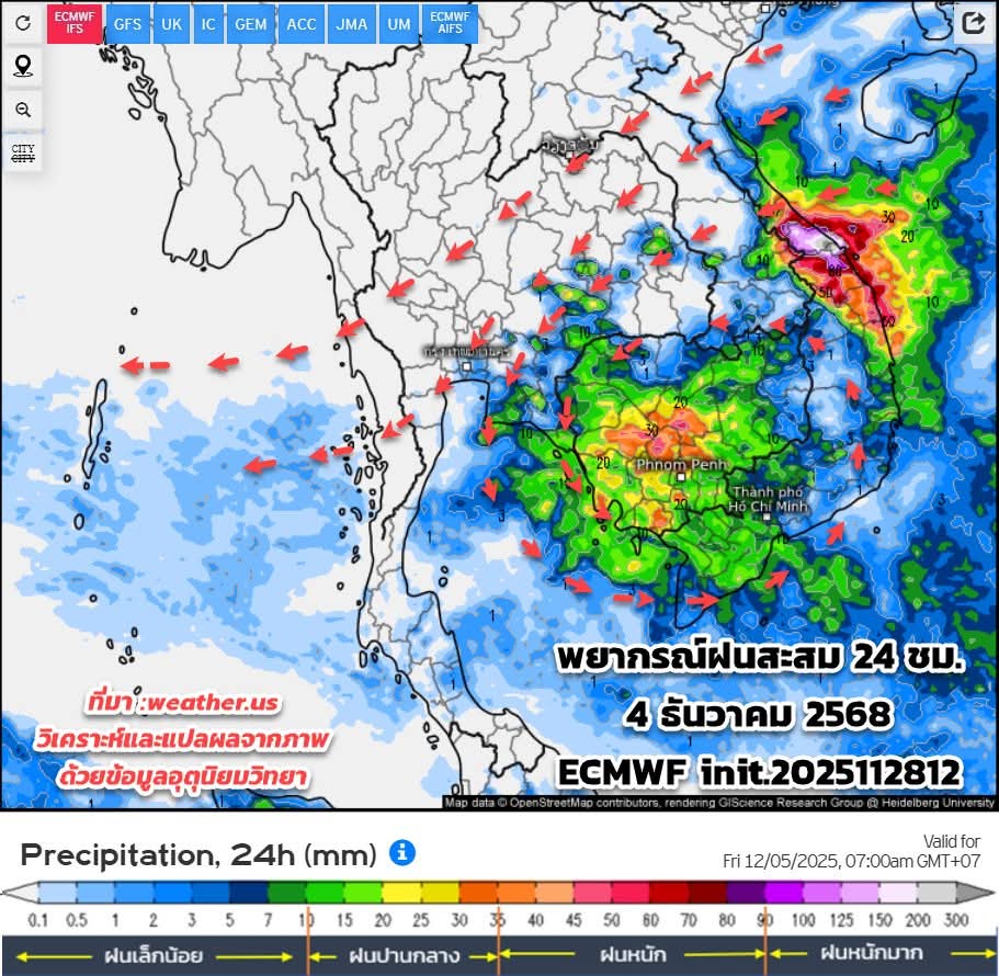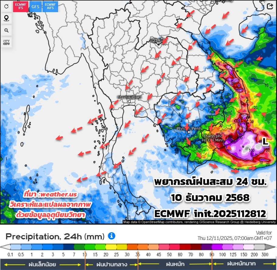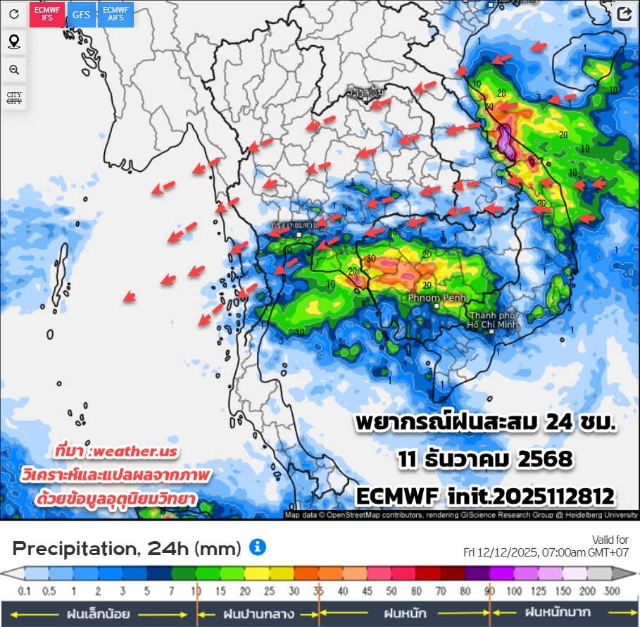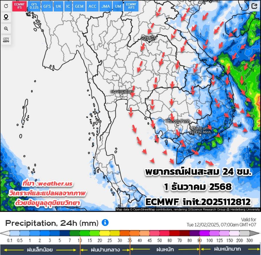 ส่วน 7 - 13 ธ.ค.68 ยังมีมวลอากาศเย็นแผ่เสริมลงมาปกคลุมประเทศไทยตอนบนเป็นระลอกๆ ลมหนาวแรงขึ้น อากาศเย็นลงบริเวณประเทศไทยตอนบน ส่วนบริเวณทะเลจีนใต้ตอนล่างมีการก่อตัวของหย่อมความดอากาศต่ำ (บริเวณเกาะบอร์เนียว) เมื่อลมหนาวแรงขึ้น จะทำให้ภาคใต้มีฝนเพิ่มขึ้นได้ แต่ยังไม่มีสัญญาณฝนตกหนักเมื่อเปรียบกับระลอกที่ผ่านมา ยังเฝ้าระวังและติดตาม(การวิเคราะห์ข้อมูลข้างต้นได้จากแบบจำลองฯ เป็นความคิดเห็นส่วนบุคคล ข้อมูลยังมีการเปลี่ยนแปลง ใช้เป็นแนวทางเพื่อประกอบการตัดสินใจการติดตามสภาพอากาศ)