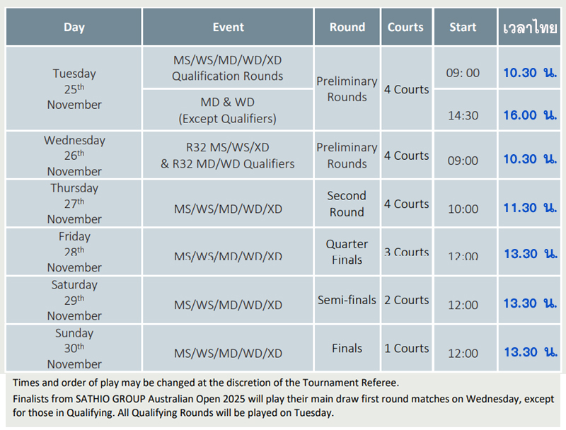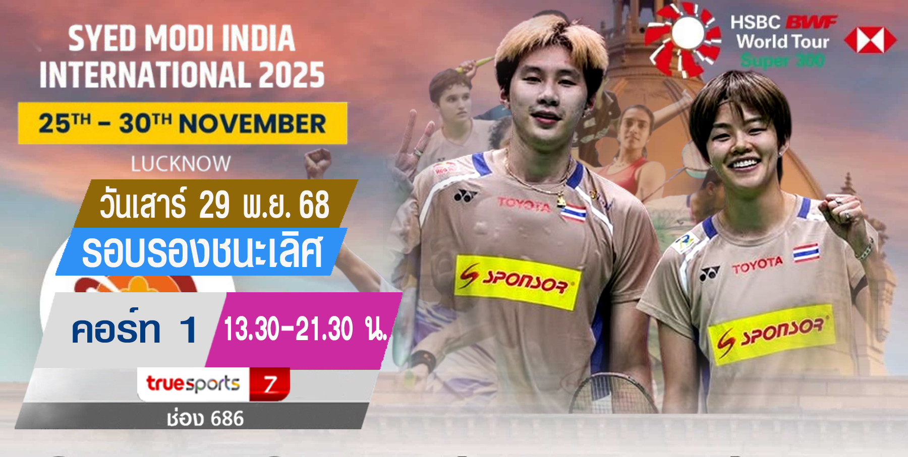โปรแกรมการแข่งขันแบดมินตัน SYED MODI India Int.2025 (13.30) & โตโยต้าชิงแชมป์ประเทศไทย 2568 (10.30) : รอบ Semi Final