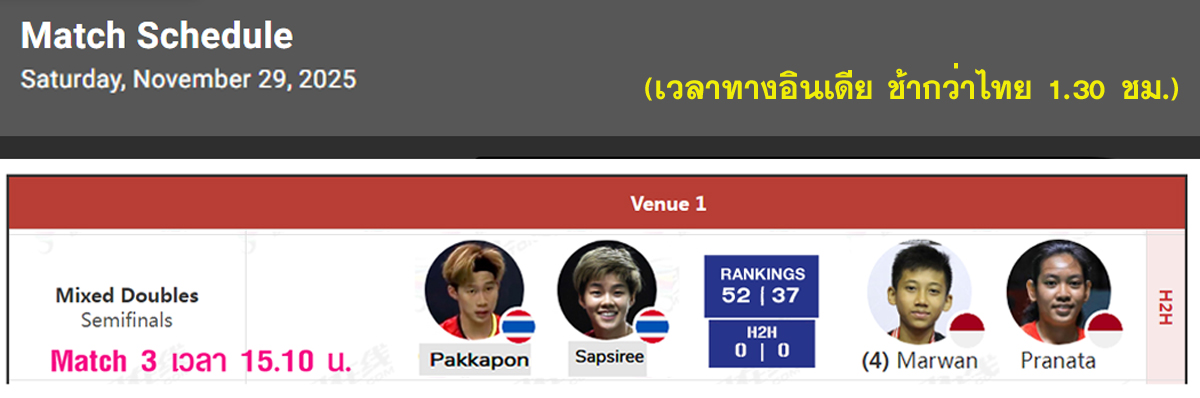 โปรแกรมการแข่งชัน แบดมินตัน SYED MODI India International 2025 : รอบรองชนะเลิศ (29 พ.ย. 68) (คู่แรก 13.30 น.)