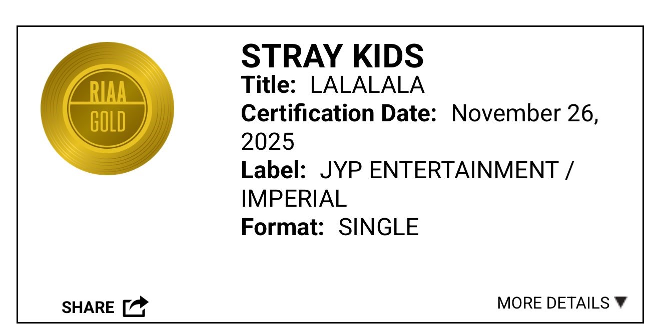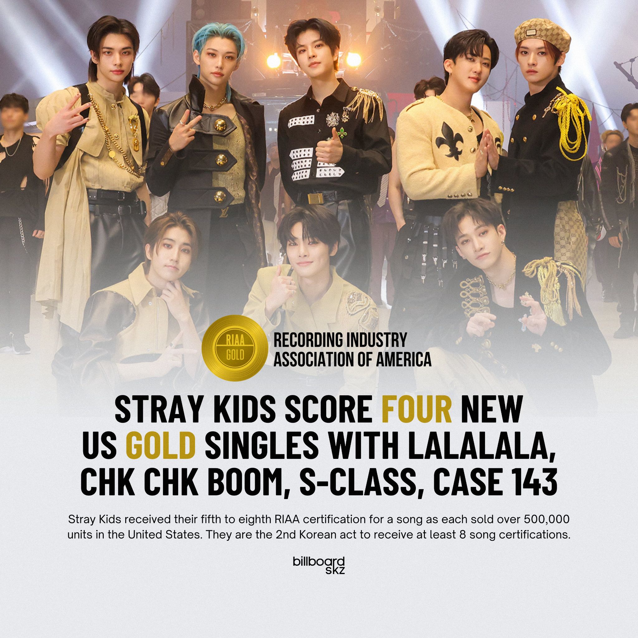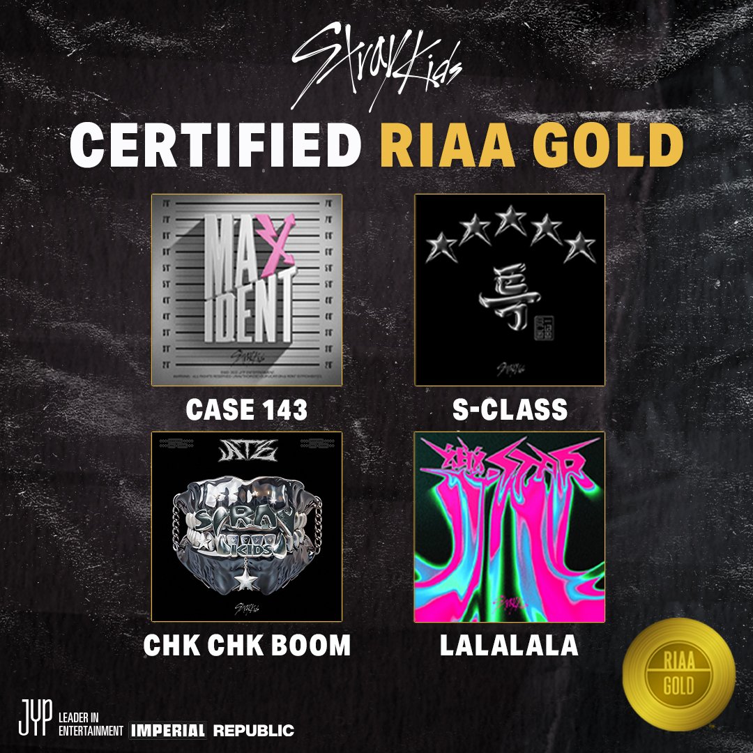 🔥 Stray Kids “LALALALA,” “Chk Chk Boom,” “S-Class,” “CASE 143” ได้รับการรับรองอย่างเป็นทางการระดับ GOLD จาก RIAA สมาคมผู้ประกอบกิจการเพลงของสหรัฐอเมริกา เนื่องจากมียอดขายเกิน 500,000 หน่วยต่อ single ในสหรัฐอเมริกา