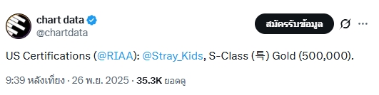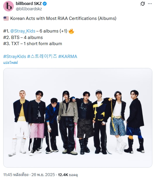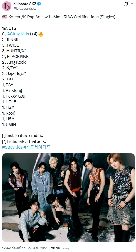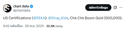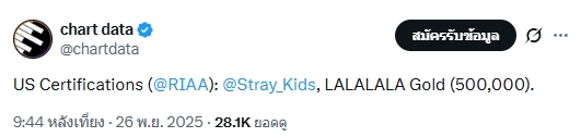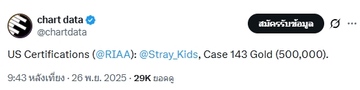 🔥 Stray Kids “LALALALA,” “Chk Chk Boom,” “S-Class,” “CASE 143” ได้รับการรับรอง RIAA GOLD และอันดับ 1 เจน 4 ที่ 14 RIAA