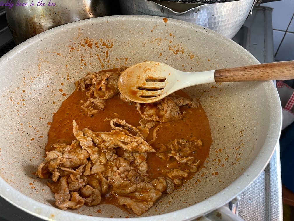 ผัดเนื้อหมูกับเครื่องแกงแดง ปรุงรสด้วยน้ำปลา น้ำตาล