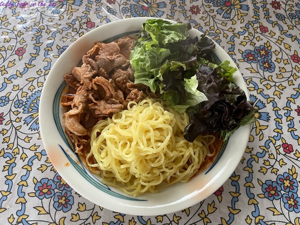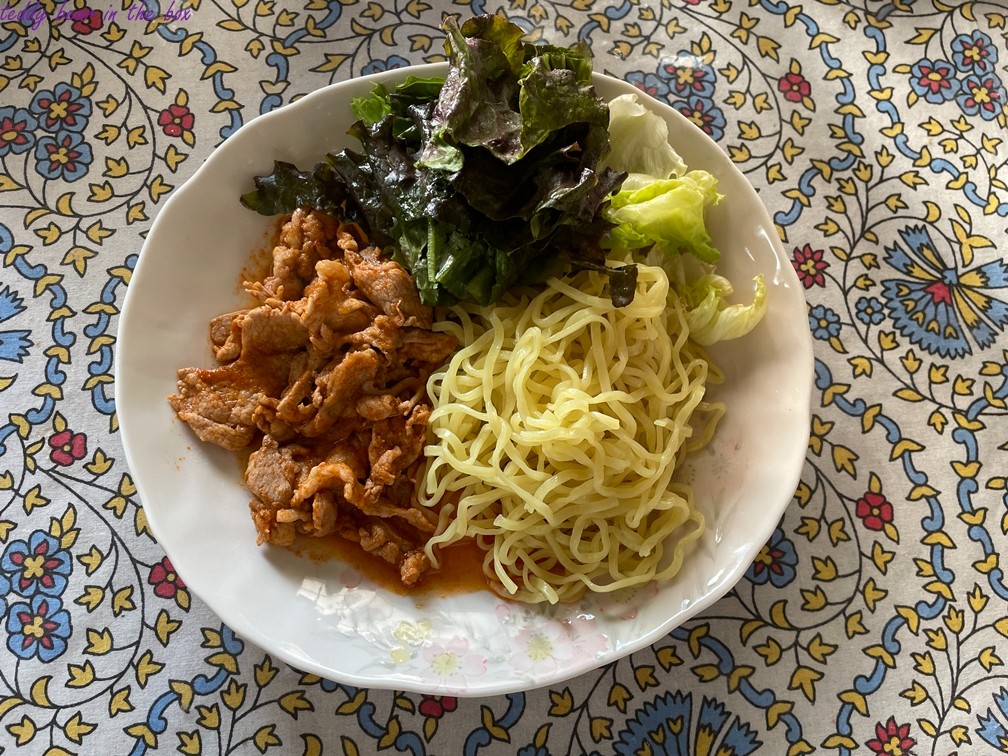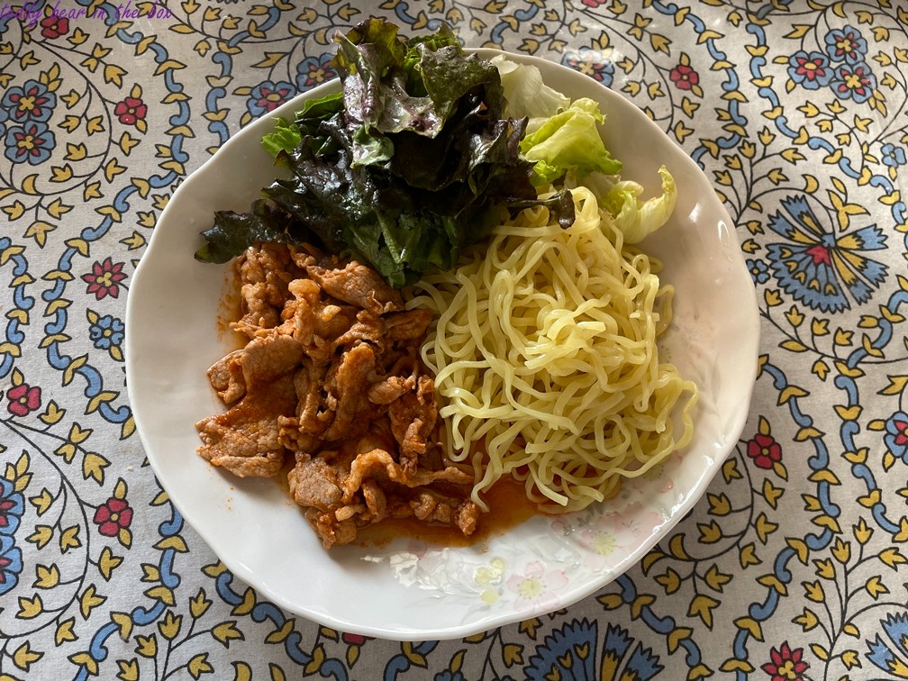 🗾 🍷👱♀️😊🤗💑 อาหารจานหมู 🐖🫚หมูผัดเครื่องแกงแดงกับเส้นราเมง และแกงจืดหัวไชเท้า 😸❤️