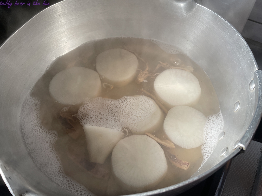 มาอุ่นอีกทีช่วงแรกไฟแรงจนเดือด หลังจากนั้นหรี่ไฟต่ำ เคียวให้หัวไชเท้านุ่ม ปรุงรสด้วยเกลือนิดเดียว