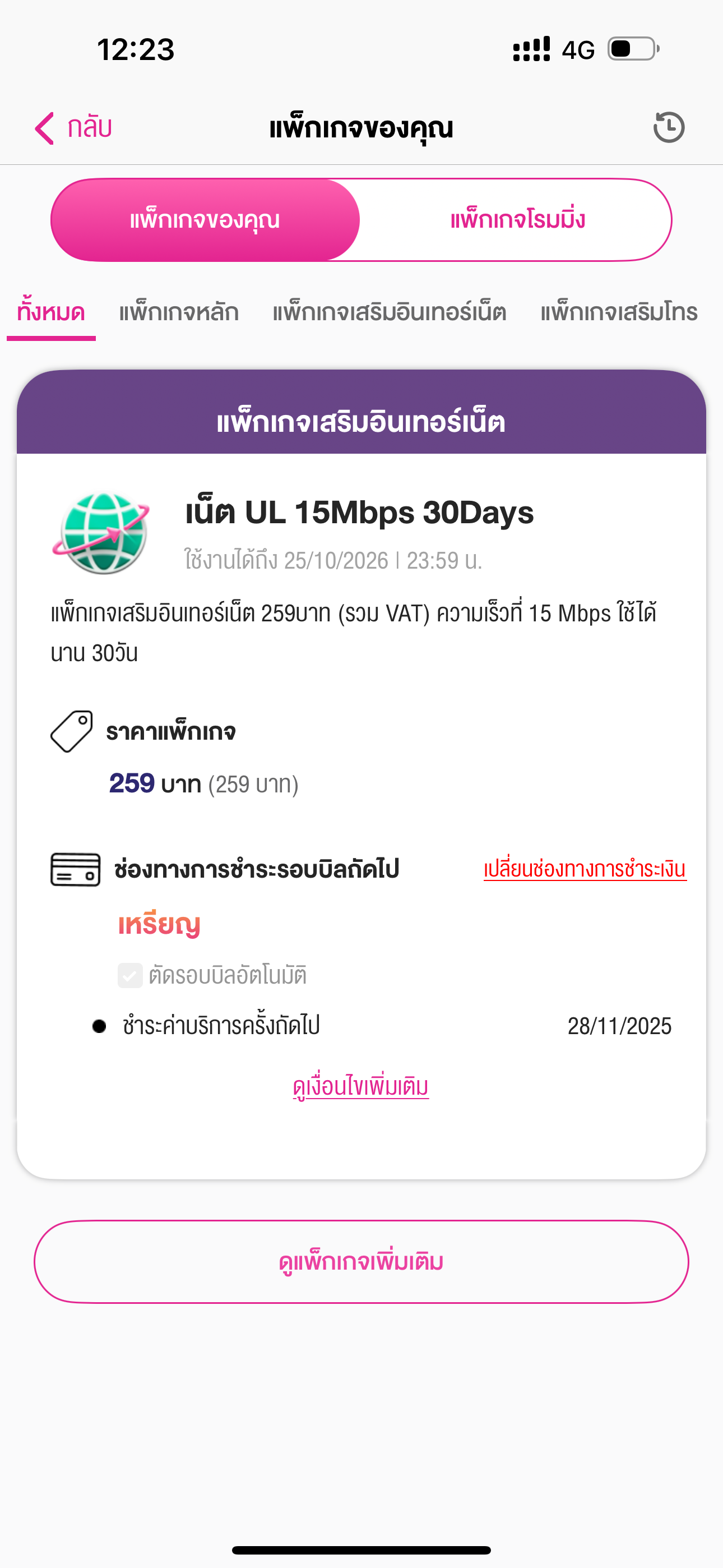 ผมเติมเงินต่อแพ็คเสริม259ต่ออายุอัติโนมัติ 15mbps gomo by ais ช่วงคืนวัน28/11/68 ผ่านMobile banking เวลา10.09น. เปิดดูมือถือว่ามีแพ็คเก็ตที่ตอไว้เข้าหรือยังก็ไม่มีเงินก็ตัดไปแล้วติดต่อไปทุกช่องทางก็ไม