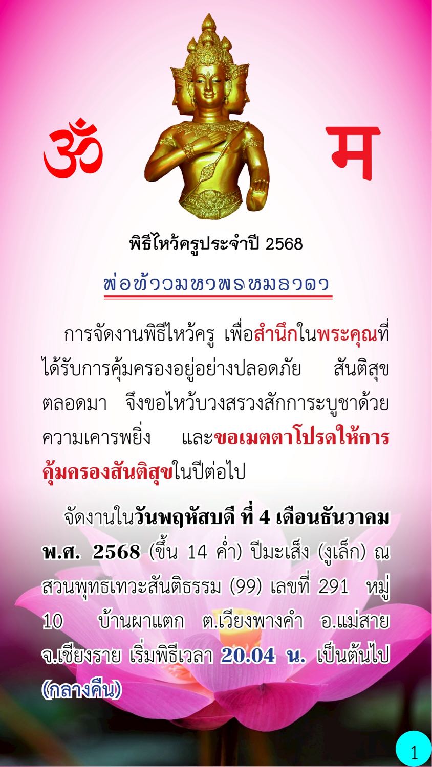 จัดงานในวันพฤหัสบดี ที่ 4 เดือนธันวาคม พ.ศ. 2568 (ขึ้น 14 ค่ำ) ปีมะเส็ง (งูเล็ก) ณ สวนพุทธเทวะสันติธรรม (99) เลขที่ 291 หมู่ 10 บ้านผาแตก ต.เวียงพางคำ อ.แม่สาย จ.เชียงราย เริ่มพิธีเวลา 20.04 น. เป็นต้นไป (กลางคืน)
