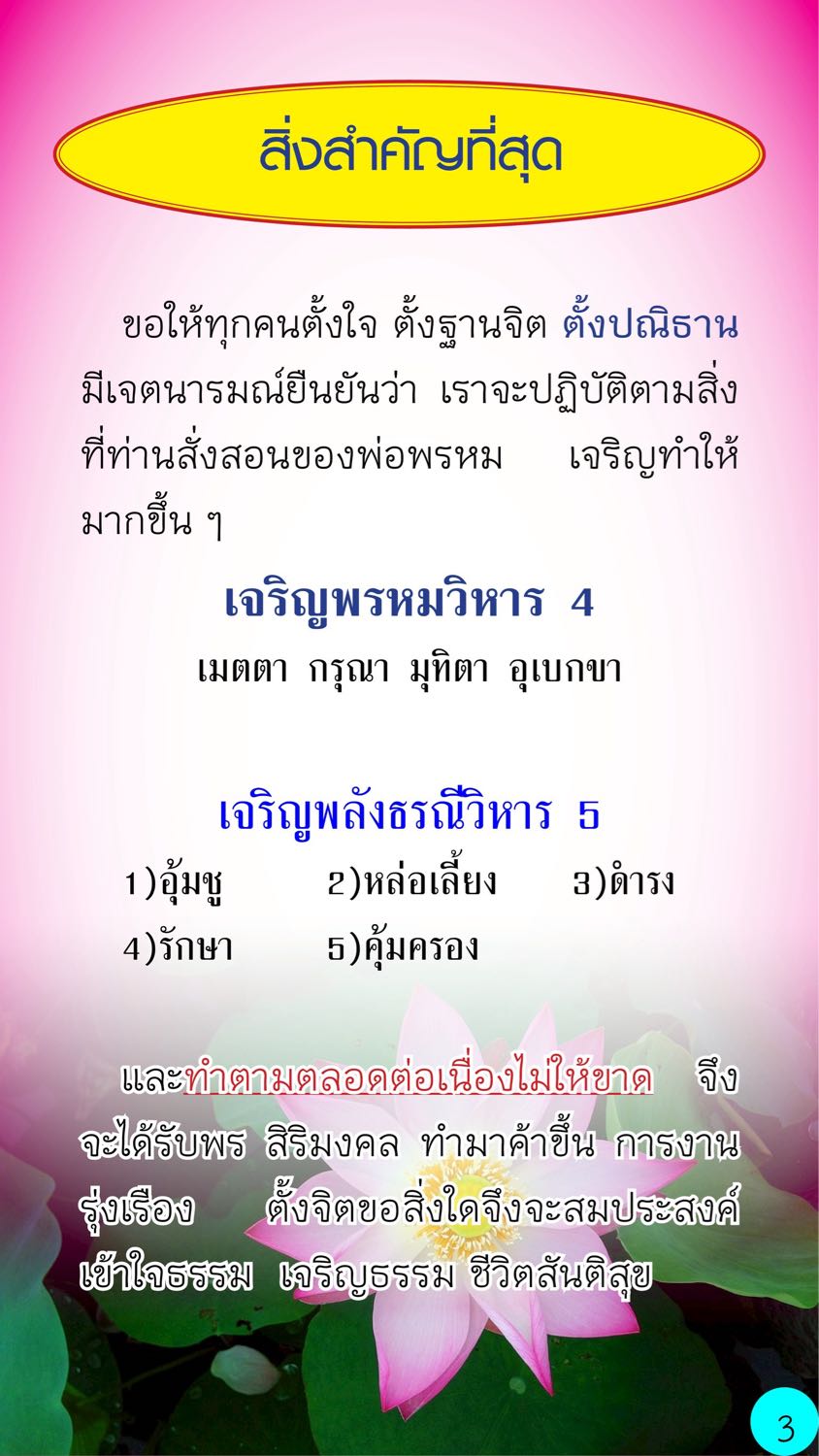 ตั้งใจ ตั้งฐานจิต ตั้งปณิธาน มีเจตนารมณ์ยืนยันว่า เราจะปฏิบัติตามสิ่งที่ท่านสั่งสอนของพ่อพรหม เจริญทำให้มากขึ้น ๆ หัวใจ ๕ ต่อองค์พ่ออย่างเต็มเปี่ยม ไม่คลอนแคลน เจริญพรหมวิหาร 4