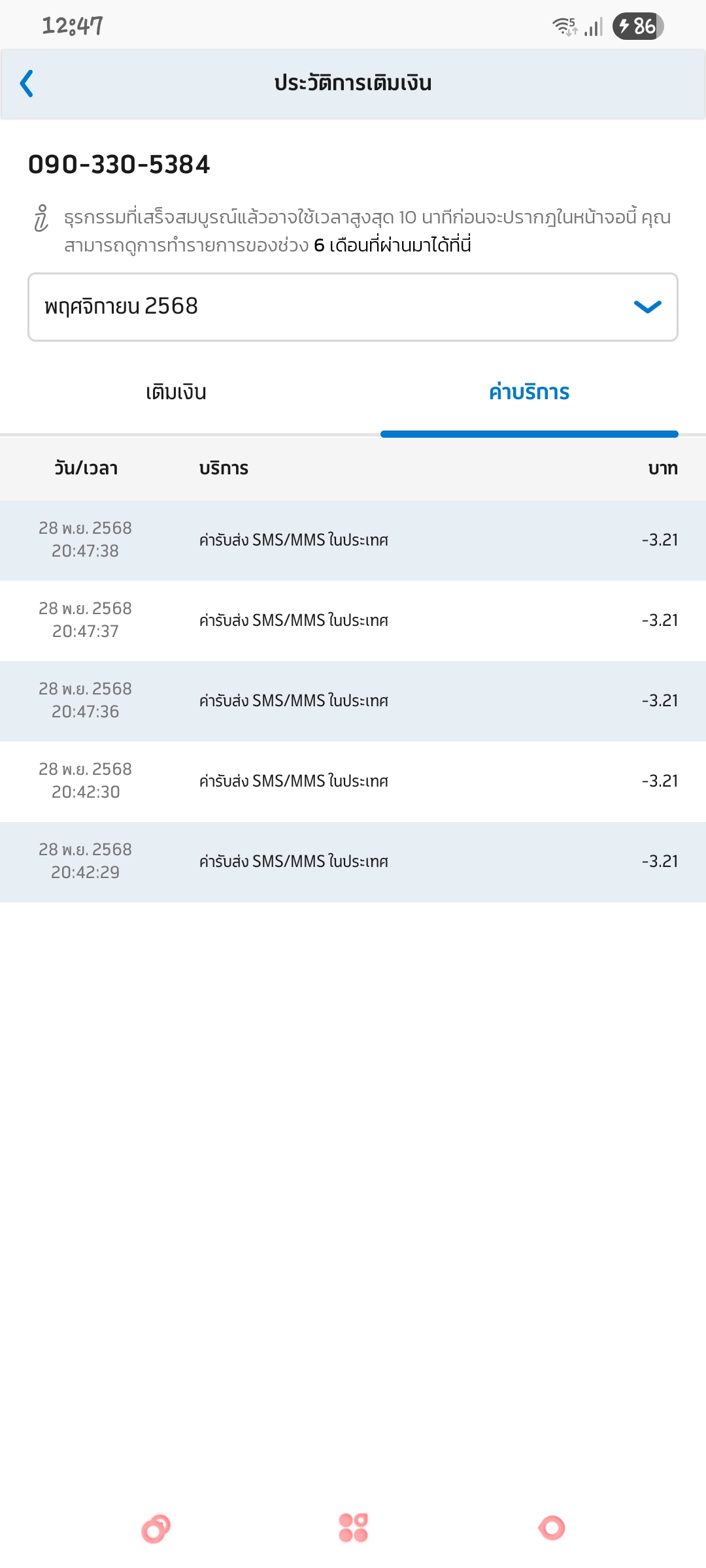 ใช้เบอร์เติมเงินของ SMS แล้วพบว่าเงินเหลือ 0 บาท เลยไปเช็คว่าใช้อะไรไปบ้าง ก็พบว่ามีช่วงเวลาหนึ่งที่มีการหักค่า SMS 3.21 บาทแบบผิดปรกติ คือวันเวลาวินาทีเดียวกัน หัก 3.21 บาท 3 รอบ และเว้นระยะวันนึงไป