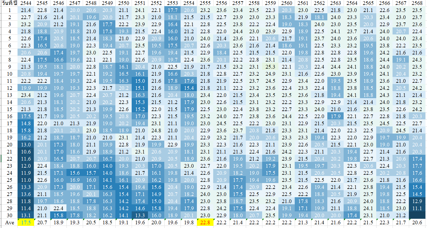 ผมตั้งกระทู้เล่าเรื่องไปหลายครั้งว่า เดือนพฤศจิกายน เมืองเชียงใหม่ไม่ได้มีอากาศหนาวเย็นมานานมากแล้ว ถ้าดูจากภาพ จะเห็นว่าปี 2568 เป็นครั้งแรกในรอบ 24 ปีเลยทีเดียวที่เดือนพฤศจิกายนอากาศหนาวเย็นลงถึง 11 องศาเซลเซียส ซึ่งเกิดขึ้นล่าสุดคือเมื่อเดือนพฤศจิกายน 2544 ด้วยระยะเวลาที่ยาวนานขนาดนี้ ผู้ใหญ่ก็อาจจะลืมไปหมดแล้ว หรือถ้าเป็นเด็กก็คงโตจนเป็นวัยทำงานไปแล้ว