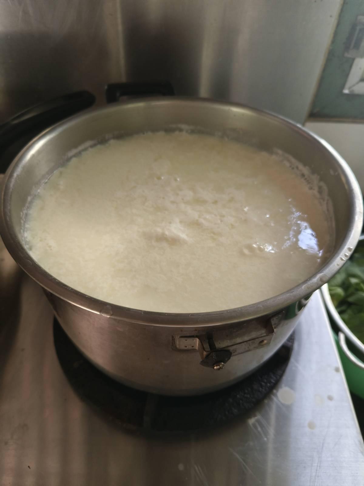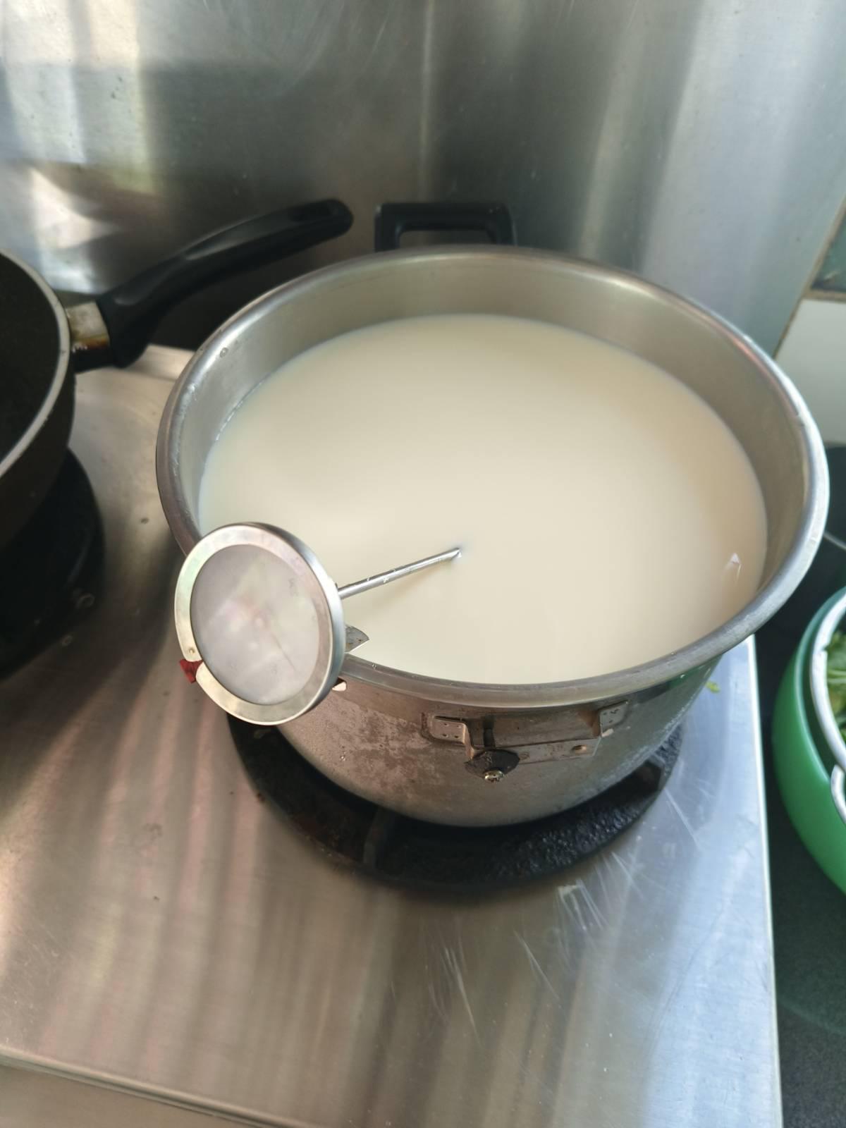 -เทน้ำส้มสายชูลงในหม้อนม ครึ่งแรกก่อน เทคนไปด้วย