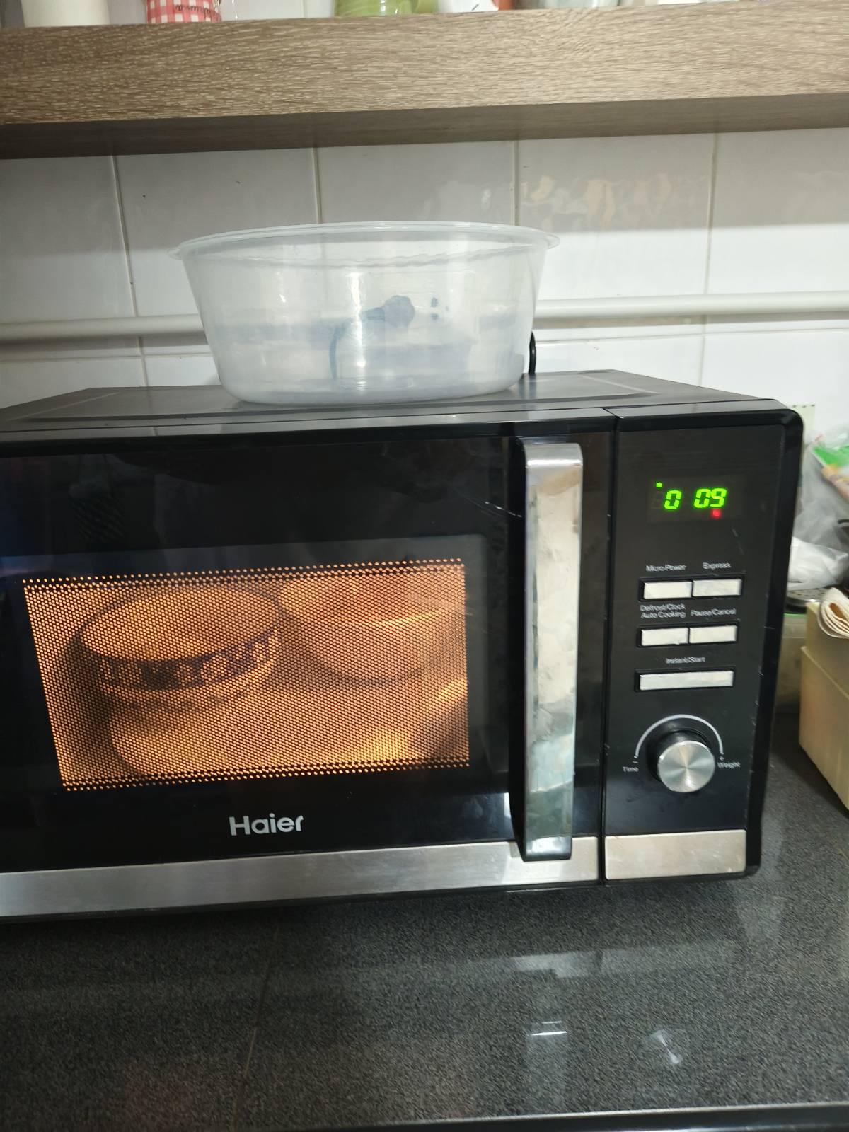 -ใช้ไมโครเวฟ ตั้งไฟกลาง(แต่ไม่ใช่ละลายน้ำแข็ง)