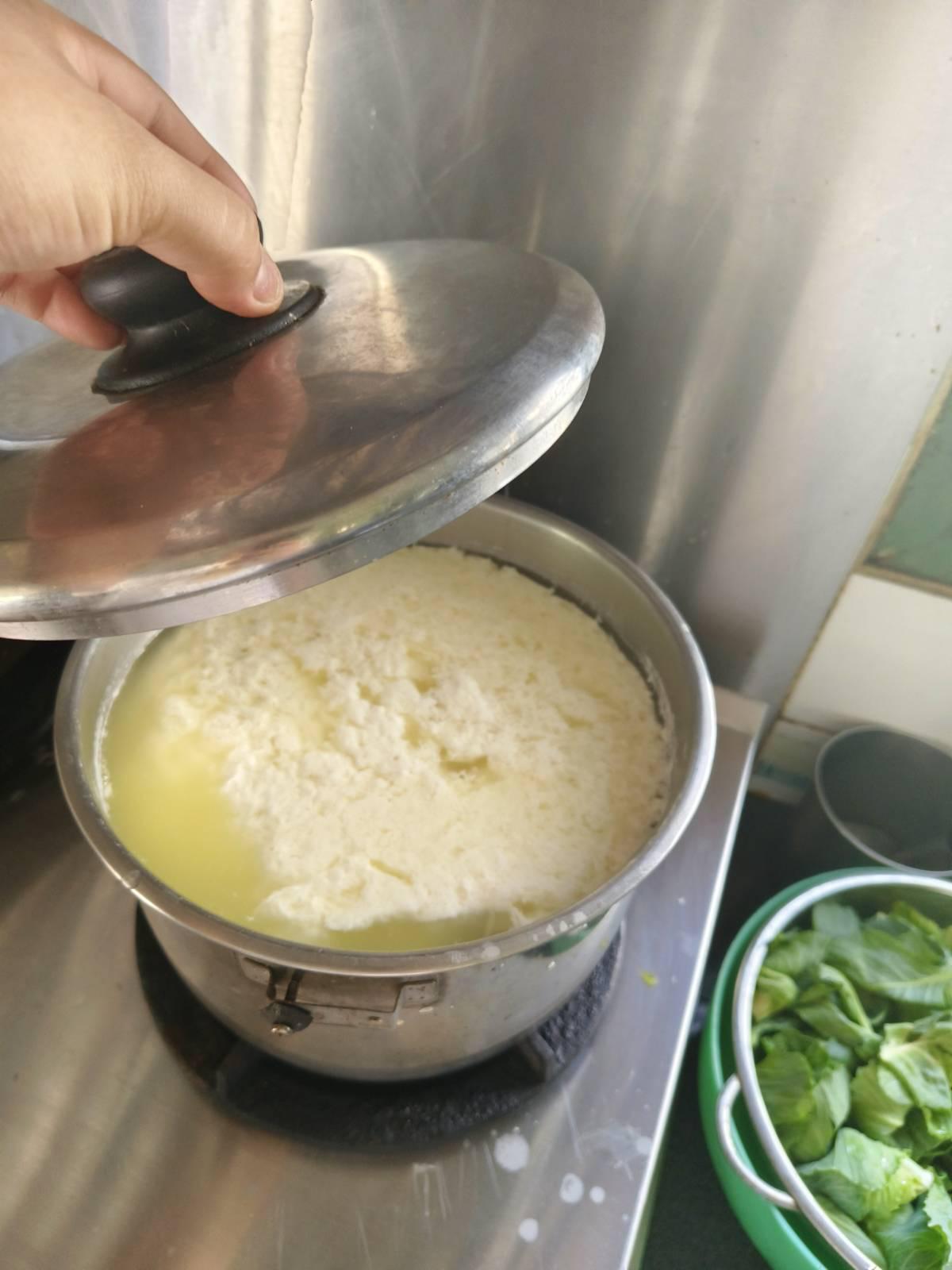-แยกชีส (curd) ใช้มีดยาวแบ่งเป็นส่วนๆได้ หั่นขวางกรองออกจากน้ำเวย์ เก็บเวย์ไว้