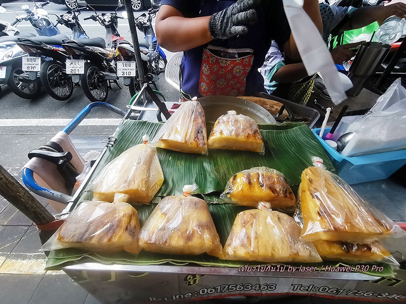 ซื้อมันสำปะหลังปิ้งยายเทียน ที่หลานแยกมาขายจากซอยแคบ ๆ ฝั่งตรงข้าม ชิ้นละ 60 บาทสองชิ้น