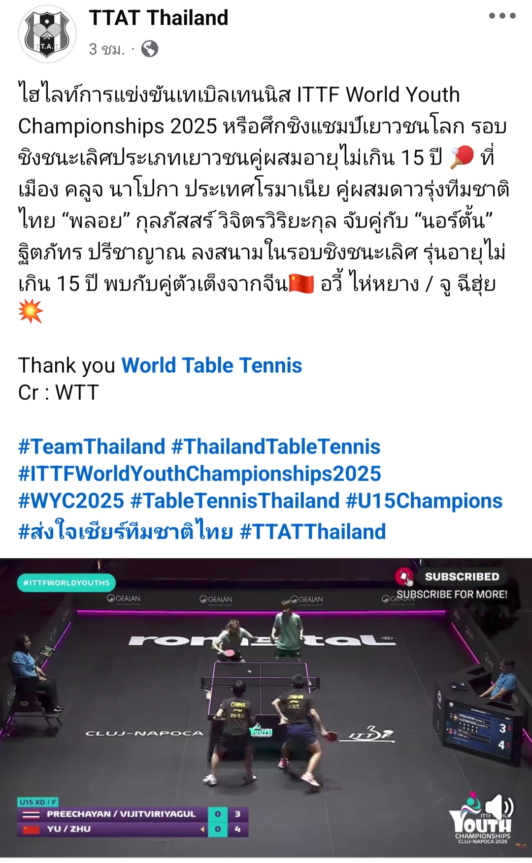 เทเบิลเทนนิสเด็กไทยชนะจีนคว้าแชมป์โลก U15