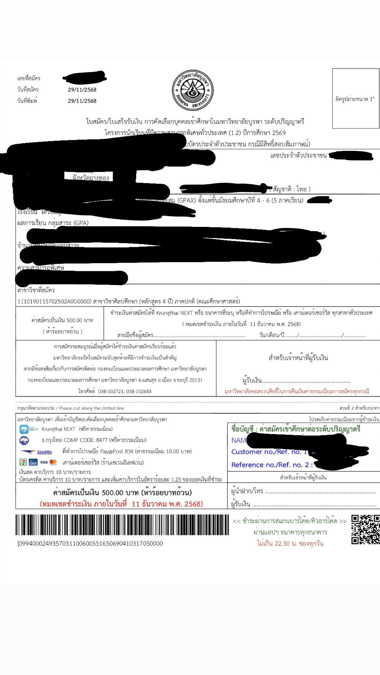 คือใส่จังหวัดผิดแล้วก็จ่ายเงินทางคิวอาร์โค้ดไปแล้วค่าสมัคร500ต้องทำใบเสร็จใหม่แล้วจ่ายเงินใหม่ไหมคะเครียดมากเลยติดต่อเจ้าหน้าที่ไม่ได้น่าจะต้องรอโทรวันราชการ