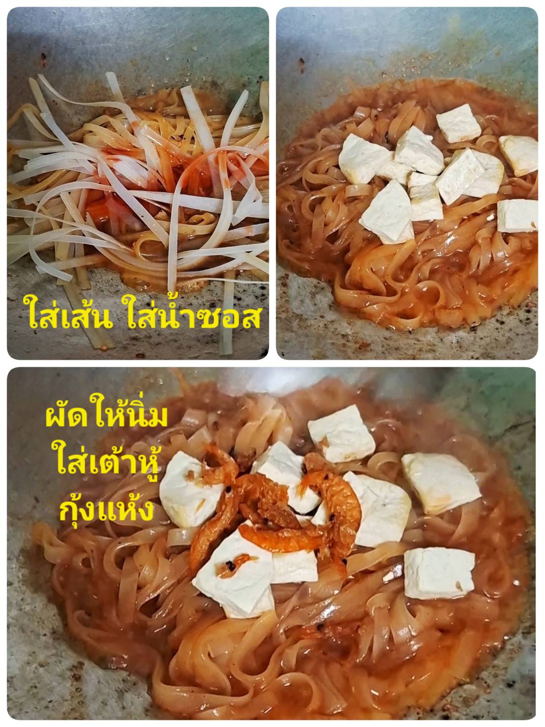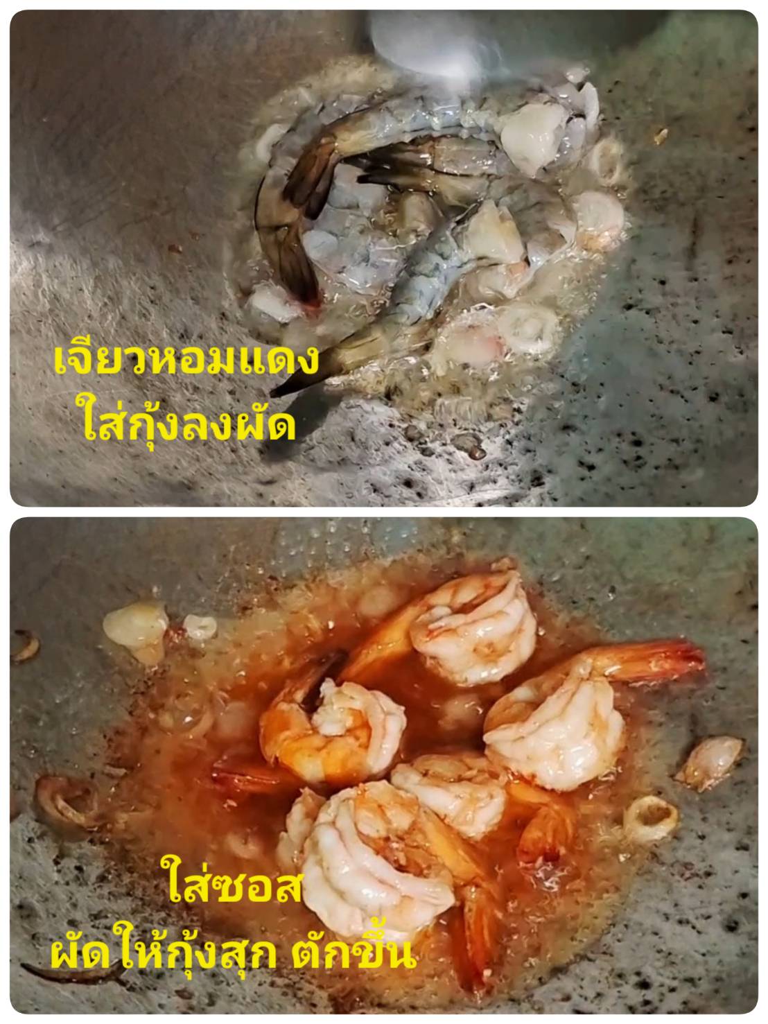 ผัดกุ้งให้สุก ตักขึ้นแล้วก็ผัดเส้น