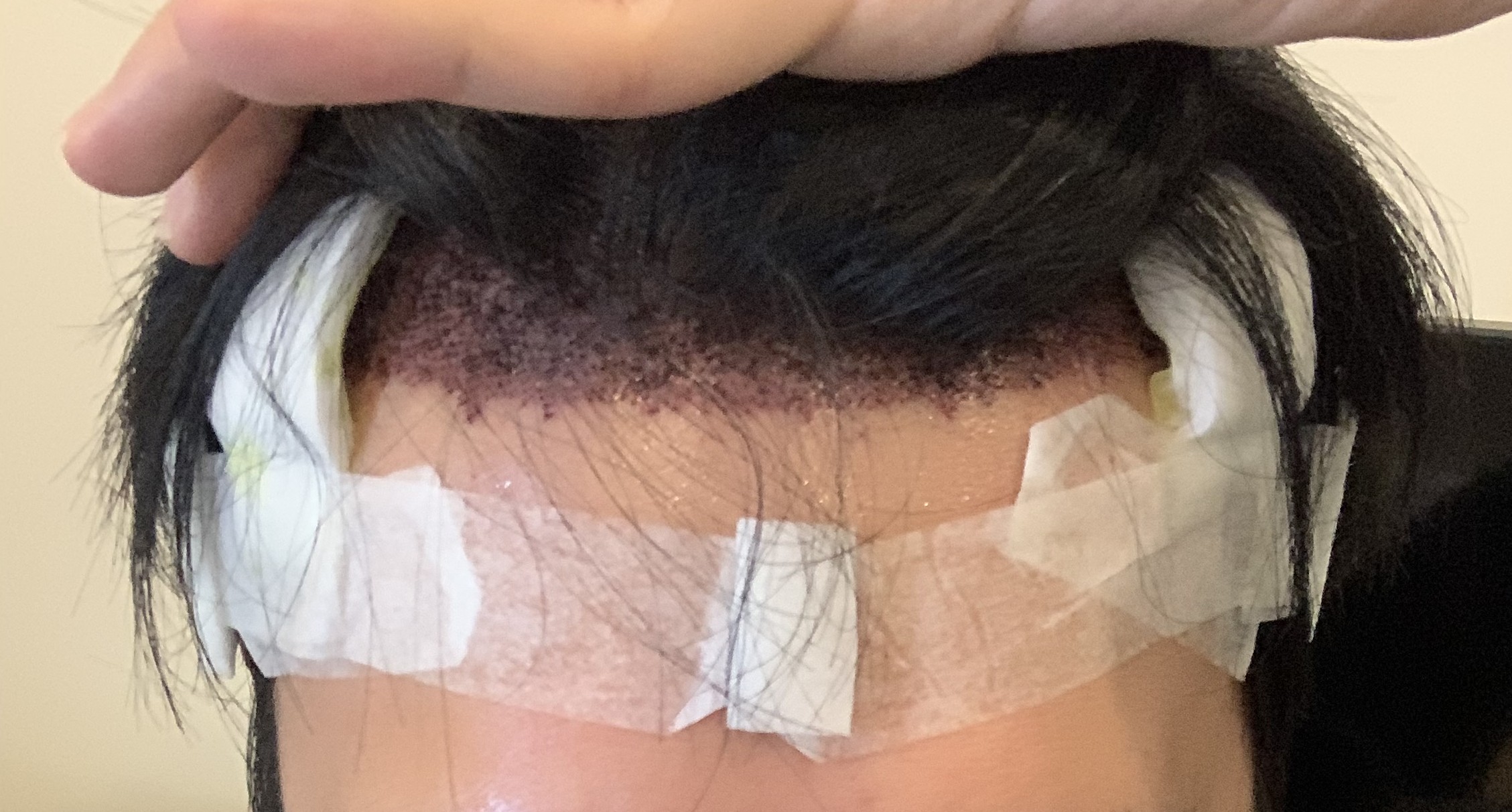 จากภาพหลังผ่าตัดคืนแรก มีแผลจากการเจาะเพื่อปลูกผมบริเวณด้านหน้า จะเห็นว่ารอยแผลเป็นเดิมโดนกลบมิดไปแล้ว