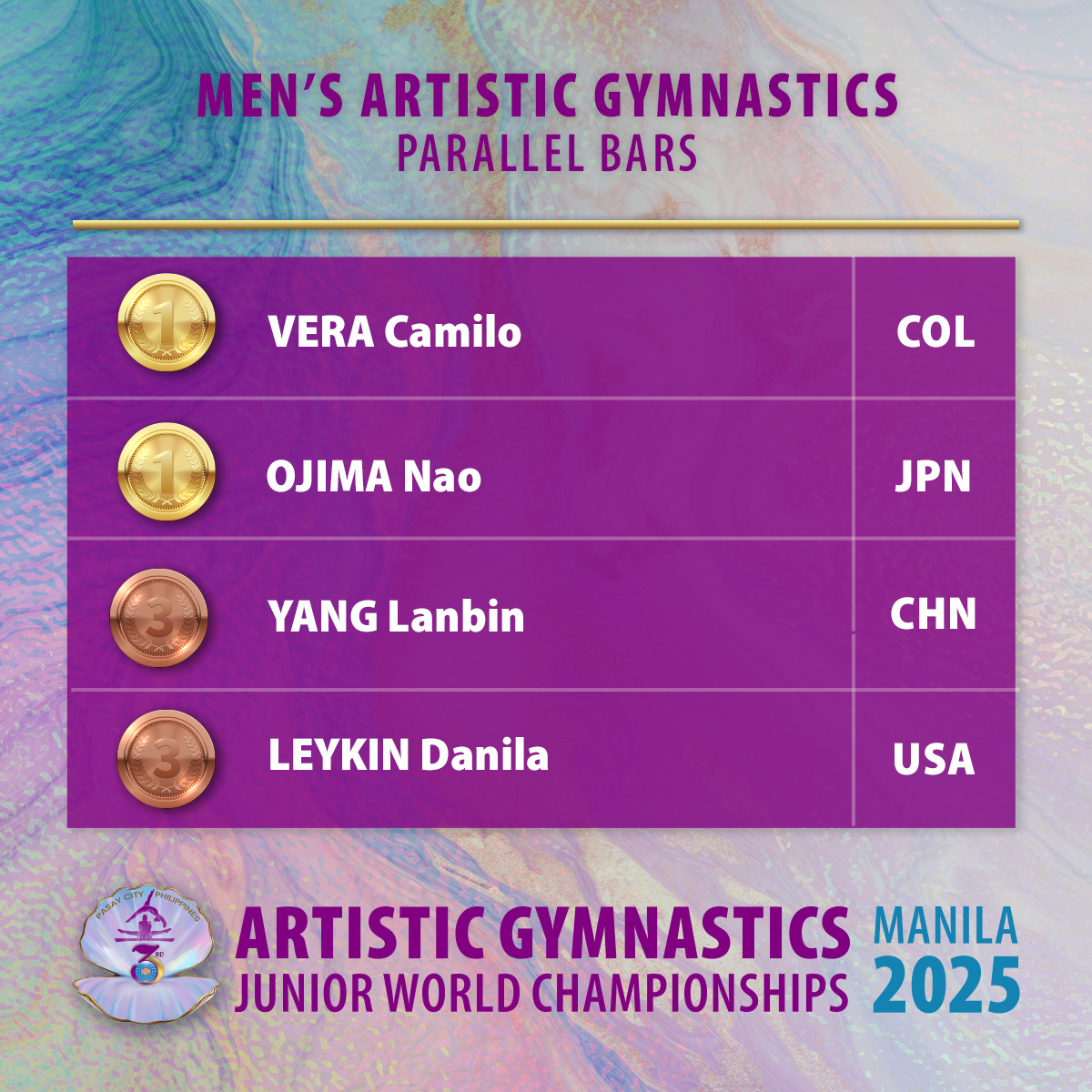 ถือเป็นครั้งแรกในประวัติศาสตร์ที่การแข่งขันยิมนาสติกสากลมีผู้ที่ได้เหรียญทองและเหรียญทองแดงพร้อมกันถึง 2 คนในการแข่งขัน ซึ่งเพิ่งเกิดขึ้นในรายการ FIG 3rd World Junior Artistic Gymnastics Championships 2025 Pasay, Philippines หรือการแข่งขันยิมนาสติกสากลเยาวชนชิงแชมป์โลกครั้งที่ 3 ปี 2025 ในเมือง Pasay ประเทศฟิลิปปินส์ โดยในประเภทบาร์คู่นั้นมีนักกีฬายิมนาสติกสากลถึง 4 คนด้วยกันที่ได้เหรียญรางวัลไปครอบครอง ที่สำคัญคนที่ได้เหรียญทองและเหรียญทองแดงยังมีถึง 2 คนด้วยกัน คือ Camilo Vera นักกีฬาชาวโคลอมเบีย และ Nao Ojima นักกีฬาชาวญี่ปุ่น เจ้าของเหรียญทองร่วมในครั้งนี้ รวมทั้ง Yang Lanbin นักกีฬาชาวจีนและ Danila Leykin นักกีฬาชาวสหรัฐอเมริกา เจ้าของเหรียญทองแดงร่วมในครั้งนี้เช่นกัน ซึ่งนั่นจึงทำให้กลายเป็นครั้งแรกในประวัติศาสตร์ที่ได้มีนักกีฬายิมนาสติกสากลที่ได้เหรียญทองและเหรียญทองแดงพร้อมกันในรายการเดียวกันครับ 😅