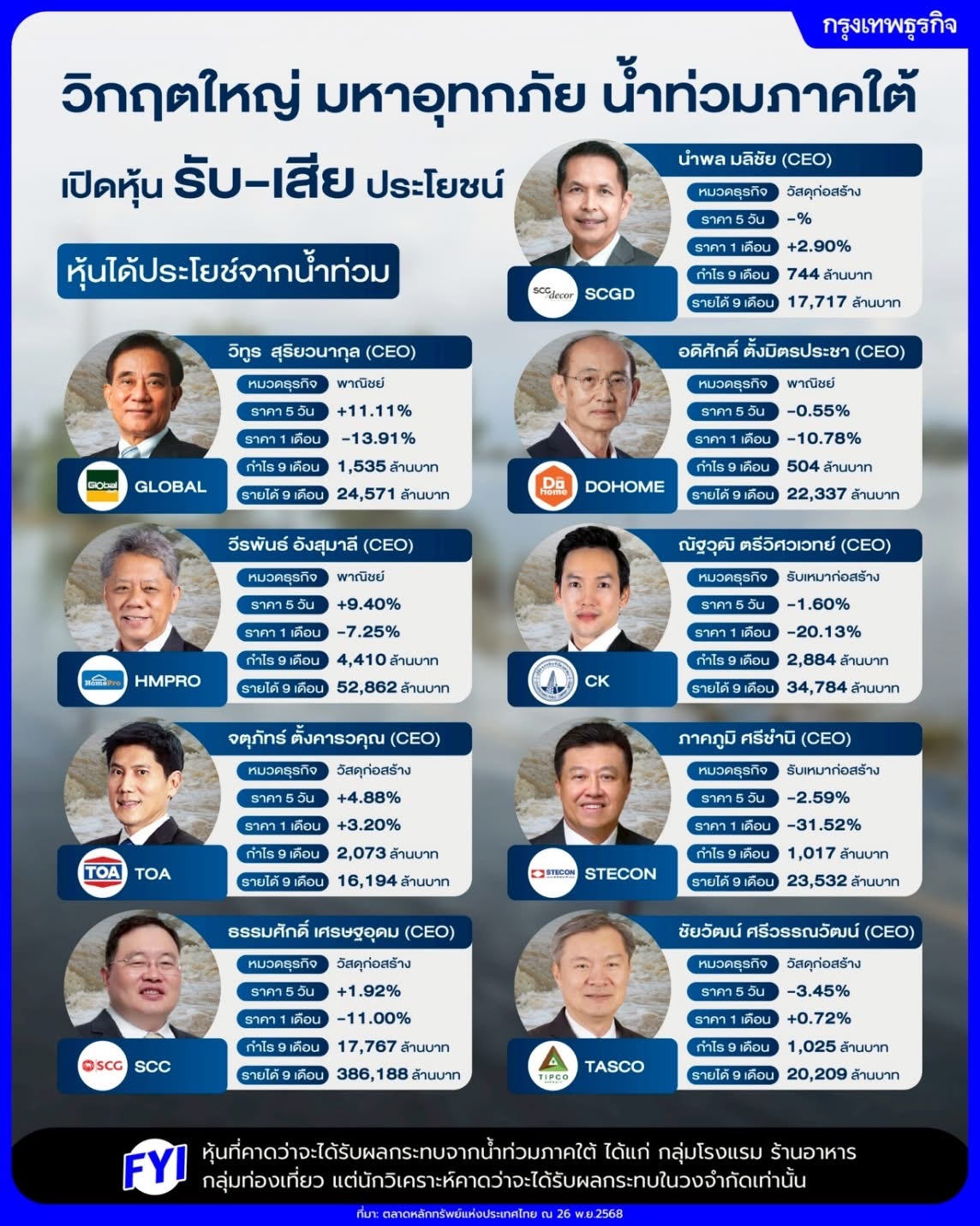 วิกฤตใหญ่ มหาอุทกภัย น้ำท่วมภาคใต้ เปิดหุ้นรับ-เสียประโยชน์
