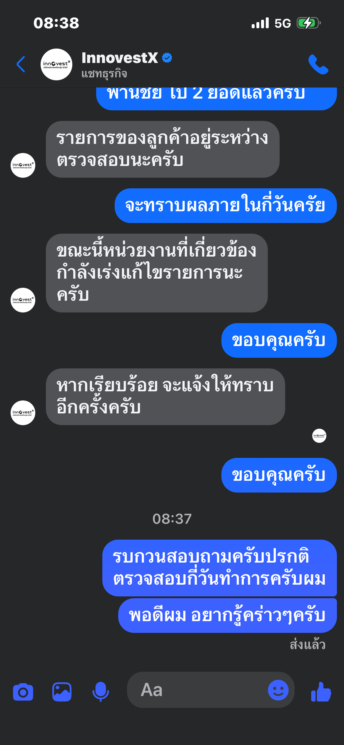ฝากเงิน ผ่าน แอ็ป innovest x ไป แจ้งระบบขัดข้อง เลยกดส่งไป 2 รอบ ตัดเงินไป 5,000 2 รอบ 10,000 โทรเข้า scb บอกรายการสมบูรณ์ ต้องติดต่อ innivest x เอง ติดต่แไป ตอนตี 5 บอกว่าต้องรอตรวจ สอบ ธุรกรรมว่าเข้าจริงไหม แต่ ถ่ายที่หักยอดไปแล้ว ปรกติกี่วันทำการครับ พอดีฝากไป ในบัญชีคริปโต กลัว ไม่ได้ราคาที่จะซื้อ ถามไป ก็บอกจะดำเนินการไห้ หรือต้องไปติดต่อ ตรงรัชดาภิเษกเองครับ เพื่อตาม ยอดที่หายไป เอง