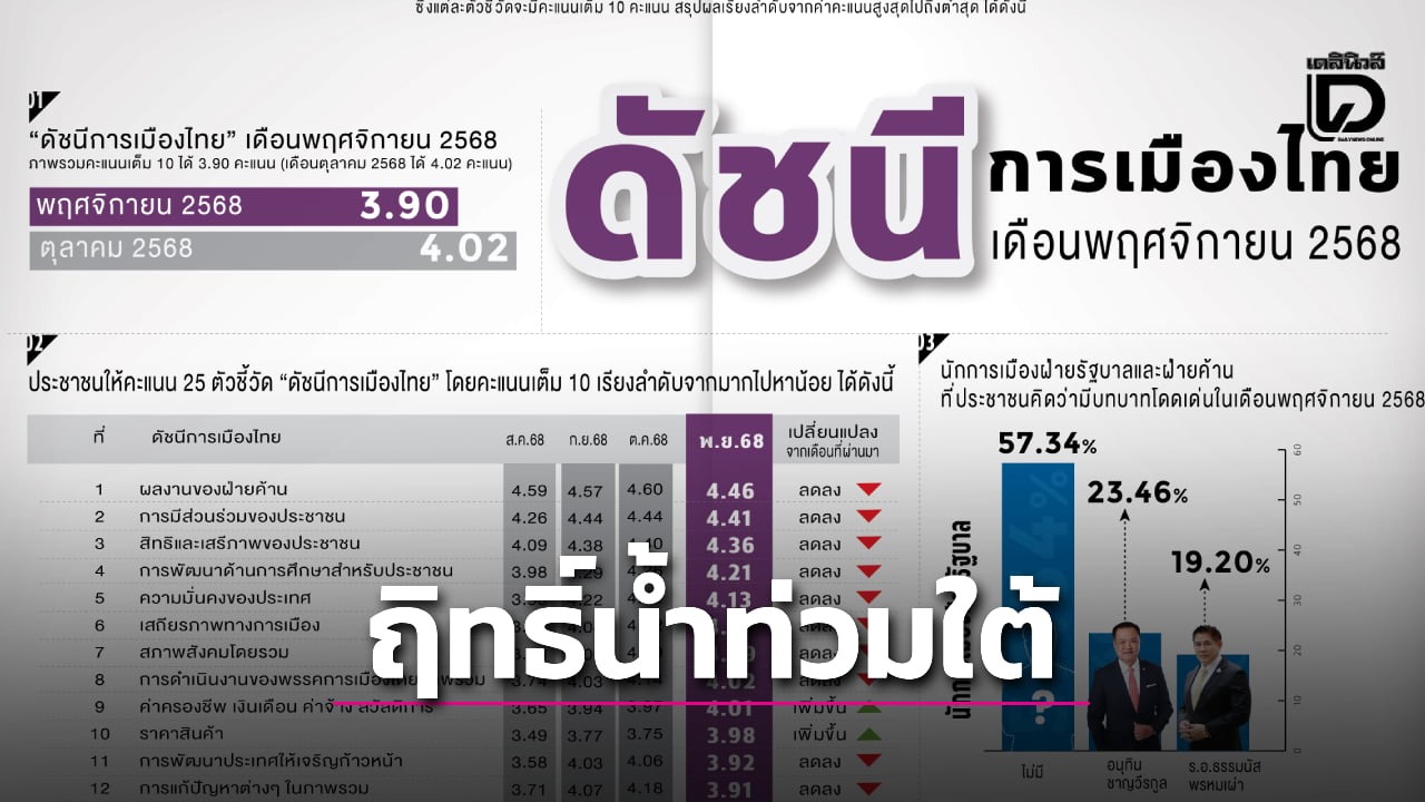 สวนดุสิตโพล เผยผลสำรวจ ดัชนีการเมืองไทย เดือน พ.ย. 68 ภาพรวมลดลงเหลือ 3.90 คะแนน แม้ "คนละครึ่งพลัส" ช่วยพยุงแต่ไม่พอ หลังเกิด มหาอุทกภัยหาดใหญ่ ขณะที่ "ณัฐพงษ์ เรืองปัญญาวุฒิ" ฝ่ายค้าน คะแนนพุ่งโดดเด่น